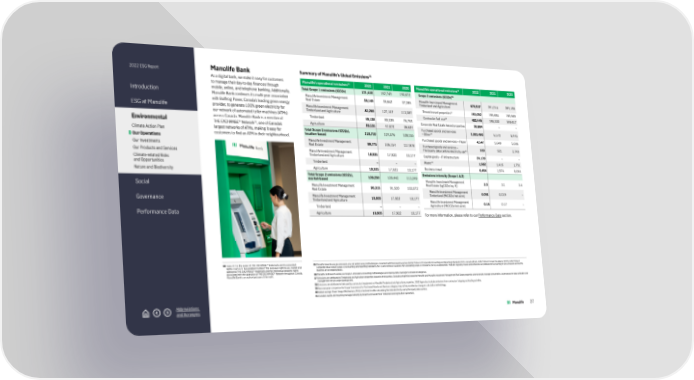 2022 ESG Report Introduction ESG at Manulife Environmental Climate Action Plan Our Operations Our Investments Our Products and Services Climate-related Risks and Opportunities Nature and Biodiversity Social Governance Performance Data Abbreviations and Acronyms Manulife Bank As a digital bank, we make it easy for customers to manage their day-to-day finances through mobile, online, and telephone banking. Additionally, Manulife Bank continues its multi-year association with Bullfrog Power, Canada’s leading green energy provider, to generate 100% green electricity for our network of automated teller machines (ATMs) across Canada. Manulife Bank is a member of THE EXCHANGE ® Network 34 , one of Canada’s largest networks of ATMs, making it easy for customers to find an ATM in their neighbourhood. 34 Fiserv EFT is the owner of THE EXCHANGE ® trademark and its associated rights. Fiserv EFT has granted FICANEX ® the exclusive right to use, market and sublicense THE EXCHANGE ® trademark and the intellectual property rights associated with the operation of THE EXCHANGE ® Network throughout Canada. Manulife Bank is an authorized user of the mark. Summary of Manulife's Global Emissions 35 Manulife’s operational emissions 35 2022 2021 2020 Total Scope 1 emissions (tCO2e) 121,418 162,749 150,672 Manulife Investment Management Real Estate 39,149 35,642 37,285 Manulife Investment Management Timberland and Agriculture 82,269 127,107 113,387 Timberland 49,138 80,035 76,753 Agriculture 33,131 47,072 36,634 Total Scope 2 emissions (tCO2e), location-based 118,710 124,076 128,155 Manulife Investment Management Real Estate 99,775 106,154 117,978 Manulife Investment Manag ement Timberland and Agriculture 18,935 17,922 10,177 Timberland – – – Agriculture 18,935 17,922 10,177 Total Scope 2 emissions (tCO2e), market-based 109,250 109,442 113,249 Manulife Investment Management Real Estate 90,315 91,520 103,072 Manulife Investment Manag ement Timberland and Agriculture 18,935 17,922 10,177 Timberland – – – Agriculture 18,935 17,922 10,177 Manulife’s operational emissions 35 2022 2021 2020 Scope 3 emissions (tCO2e) 36 Manulife Investment Management Timberland and Agriculture 675,537 391,014 359,186 Tenant leased properties 37 193,092 195,684 199,569 Contractor fuel use 38 482,445 195,330 159,617 Corporate Real Estate leased properties 30,994 – – Purchased goods and services – Other 39 1,003,493 6,570 8,445 Purchased goods and services – Paper 4,547 5,649 5,696 Purchased goods and services – Third-party data centres electricity use 40 100 921 2,749 Capital goods – IT Infrastructure 24,139 – – Waste 41 1,982 1,416 1,751 Business travel 6,464 1,974 6,044 Emissions intensity (Scope 1 & 2) Manulife Investment Manag ement Real Estate (kgCO2e/sq. ft) 2.3 3.1 3.4 Manulife Investment Management Timberland (MtCO2e/net acre) 0.091 0.019 – Manulife Investment Management Agriculture (MtCO2e/net acre) 0.15 0.17 – For more information, please refer to our Performance Data section. 35 Manulife Greenhouse gas emissions are calculated using methodologies consistent with the Greenhouse Gas (GHG) Protocol: A Corporate Accounting and Reporting Standard (2015, revised edition), GHG Protocol: Scope 2 Guidance (2015), GHG Protocol Corporate Value Chain (Scope 3) Accounting and Reporting Standard (2011) and Technical Guidance for Calculating Scope 3 Emissions (2013) as appropriate. Manulife regularly reviews and enhances our protocols for accounting of GHG emissions across the business on an ongoing basis. 36 Manulife continues to evolve our Scope 3 emissions accounting metho dologies and improve data coverage to include all categories. 37 Emissions are attributed to Timberland and Agriculture properties leased to third-parties. Excludes properties leased to Manulife and Manulife Investment Management Real Estate properties where tenants manage consumption, as processes for data collection and management remain under development. 38 Emissions are attribute d to fuel used by contractors’ equipment on Manulife Timberland and Agriculture properties. 2022 figure also includes emissions from contractors’ shipping and hauling activities. 39 Year-over-year comparison for Scope 3 emissions for Purchased Goods and Services category may not be possible due change in calculation methodology. 40 Global average Power Usage Effectiveness (PUE) is factored in while calculating the total electricity use by third-party data centres. 41 Excludes waste and recycling managed directly by tenants and waste from Timberland and Agriculture operations. 27