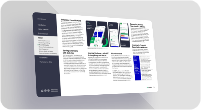 2022 ESG Report Introduction ESG at Manulife Environmental Social Community Investment Volunteering and Giving Financial Inclusion Diversity, Equity, and Inclusion Talent Management Wellness, Health, and Safety Customer Experience and Well-being Governance Performance Data Abbreviations and Acronyms Enhancing ManulifeMOVE ManulifeMOVE integrates activity-tracking and insurance solutions to motivate healthy habits among our customers. The flagship program, delivered through the proprietary MOVE app, is a pioneer in its commitment to continue investing in products as well as digital transformation to simplify the customer experience as well as increase access to insurance services. During the year, we integrated features of management and access to insurance policy information into the product so that customers can conveniently monitor their insurance policies and quickly access digital solutions. For eligible users in Vietnam, customers can access the hospital fee guarantee card and locate the nearest Manulife-affiliated medical facility by GPS. Serving Americans with Diabetes John Hancock Aspire™ with Vitality, is the first-of-its-kind life insurance product designed specifically for Americans with diabetes. Launched in 2019 through a collaboration with Verily and Onduo, John Hancock Aspire™ is helping a historically underserved population within the U.S. secure their financial future, with the benefits of a comprehensive diabetes management program. Approximately 20 million Americans are living with either type 1 or type 2 diabetes, and half either don’t have life insurance or do not have enough life insurance. Insuring Customers with HIV in Hong Kong and Macau Manulife Hong Kong and Macau announced the offering of individual life insurance coverage to customers who are diagnosed with Human Immunodeficiency Virus (HIV), ensuring financial security for their loved ones and families as part of our mission to modernize traditional underwriting policies and increase the accessibility of life insurance products and services for customers. We also expanded the definition of family as beneficiaries for policies and accept same-sex partners to purchase life insurance policies for their loved ones where insurable interest exists. Microinsurance In 2021, Manulife Indonesia launched Asuransi Aman Bersama Adira Finance (AMANDIRA), a simple and affordable term life insurance option for Adira Multi-Finance and Bank Danamon customers and their families. In 2022, Manulife launched the Sharia version, AMANDIRA Syariah, which is managed according to sharia principles to cater to the needs of Adira Finance customers, especially in Aceh Sumatra. In 2022, Manulife launched the first digital bancassurance product, MiFirst Life Protector (MiFLIP), available through the DBS digibank application. This aligns with our commitment to deliver continuous innovation and ease of services to reach out to as many customers as possible, especially millennials, with a digital solution. Supporting Business Education in Cambodia Manulife Cambodia, in partnership with Sathapana Bank, a leading commercial bank in Cambodia, Khmer Enterprise, and Credit Guarantee Corporation of Cambodia (CGCC), successfully launched the first cohort of I’m Financially Literate (IFL) to provide non-financial services to SMEs, MSMEs, and women in business. The material of the course is designed to solve challenges faced by business owners including a lack of business acumen and financial literacy skills. Investing in Financial Opportunity and Access As part of our approach to our Community Investment, we focus on the following areas to support and enable global access to financial products and services. We aim to: Enable Behaviour/ Attitude Changes • Increase awareness and action to set short-term and long-term financial goals that meet individual needs and expectations • Empower individuals to design and pursue career pathways Increase Skills/ Personal Effectiveness • Increase an individual’s ability to manage personal finances and/or help them gain new qualifications/skills Improve Quality of Life/ Well-being • Improve a sense of belonging, resilience, and greater social connections • Enable individuals to maintain meaningful employment in their industry of choice, increase their earning potential, and/or protect their financial security Photo source: https://apps.apple.com/us/app/manulifemove/id1031487052 51