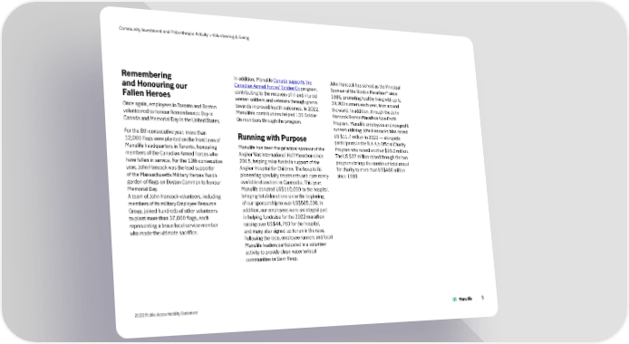 Community Investment and Philanthropic Activity > Volunteering & Giving Remembering In addition, Manulife Canada supports the John Hancock has served as the Principal ® and Honouring our Canadian Armed Forces’ Soldier On program, Sponsor of the Boston Marathon since Fallen Heroes contributing to the recovery of ill and injured 1986, promoting healthy living with up to women soldiers and veterans through grants 30,000 runners each year, from around Once again, employees in Toronto and Boston towards improved health outcomes. In 2022, the world. In addition, through the John volunteered to honour Remembrance Day in Manulife’s contributions helped 130 Soldier Hancock Boston Marathon Non-Profit Canada and Memorial Day in the United States. On members through the program. Program, Manulife employees and non-profit runners utilizing John Hancock’s bibs raised For the 8th consecutive year, more than Running with Purpose US $11.7 million in 2022 — alongside 12,000 flags were planted on the front lawn of participants in the B.A.A.’s Official Charity Manulife headquarters in Toronto, honouring Manulife has been the principal sponsor of the Program who raised another $20.2 million. members of the Canadian Armed Forces who Angkor Wat International Half Marathon since The US $32 million raised through the two have fallen in service. For the 13th consecutive 2015, helping raise funds in support of the programs brings the combined total raised year, John Hancock was the lead supporter Angkor Hospital for Children. The hospital is for charity to more than US$460 million of the Massachusetts Military Heroes Fund’s pioneering specialty treatments and care rarely since 1989. garden of flags on Boston Common to honour available elsewhere in Cambodia. This year, Memorial Day. Manulife donated US$110,000 to the hospital, A team of John Hancock volunteers, including bringing total donations since the beginning members of its military Employee Resource of our sponsorship to over US$585,000. In Group, joined hundreds of other volunteers addition, our employees were an integral part to plant more than 37,000 flags, each in helping fundraise for the 2022 marathon representing a brave local service member raising over US$44,760 for the hospital, who made the ultimate sacrifice. and many also signed up to run in the race. Following the race, employee runners and local Manulife leaders participated in a volunteer activity to provide clean water to local communities in Siem Reap. 2022 Public Accountability Statement 9