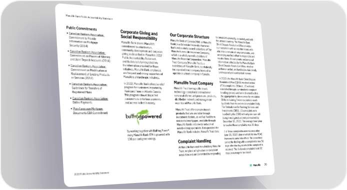 Manulife Bank Public Accountability Statement Public Commitments Corporate Giving and Our Corporate Structure to complaints promptly, accurately and with • Canadian Bankers Association: Social Responsibility Manulife Bank of Canada (MBC or Manulife the utmost courtesy. The Manulife Bank Commitment to Provide Bank) is a Schedule I federally chartered Client Dispute Resolution Office provides Information on Mortgage Manulife Bank shares Manulife’s bank and a wholly owned subsidiary of The our customers with accessible means with Security (2014) commitment to volunteerism, Manufacturers Life Insurance Company, which to communicate any complaints, and community development and corporate which is a wholly owned subsidiary of we employ our best effort to respond to and • Canadian Bankers Association: giving as described in Manulife’s 2022 Manulife Financial Corporation. Manulife resolve them. All complaints and personal Commitment on Powers of Attorney Public Accountability Statement, Trust Company (Manulife Trust), a information collected by the Manulife Bank and Joint Deposit Accounts (2014) and its data is fully integrated into subsidiary of Manulife Bank, is a federally Client Dispute Resolution Office, whether • Canadian Bankers Association: the information provided for those incorporated trust company licensed to written or verbal, are handled in a fair, timely, Commitment on Modification or initiatives. Manulife Bank employees operate as a trust company in Canada. professional and confidential manner. Replacement of Existing Products are frequent and strong supporters of Manulife’s philanthropic initiatives. In 2022, the Manulife Bank Client Dispute or Services (2012) Manulife Trust Company Resolution Office (CDRO) received a total • Canadian Bankers Association: In 2022, Manulife Bank offered a relief of 26 complaints. Of those, 10 were not Guidelines for Transfers of program for customers impacted by Manulife Trust leverages the brand, escalated through our standard complaint Registered Plans Hurricane Fiona in Atlantic Canada. technology, operational and customer handling process and were directed back to This program allowed impacted service platforms and processes, products, the appropriate business areas for resolution. • Canadian Bankers Association: customers to defer loan payments distribution network and management Of the remaining 3 were escalations made Online Payments and access locked-in money. expertise of Manulife Bank. by clients from the external complaints body, • Plain Language Mortgage Manulife Trust offers simple deposit The Ombudsman for Banking Services and Documents CBA Commitment products that are available through Investments (OBSI). 13 complaints were investment dealers, as well as fixed-term handled by the CDRO with only one case still residential mortgages, available through being investigated and not yet resolved by Manulife Bank’s nationwide network of December 31, 2022. The average time taken retail lending specialists. Data provided for to resolve these complaints was 31 days. ® By working together with Bullfrog Power , Manulife Bank includes Manulife Trust data. 7 of these complaints were received after every Manulife Bank ATM is powered with June 30, 2022, date at which the new FCAC 100 per cent green energy. Complaint Handling framework came into effect. The prescribed period for dealing with a complaint is now 56 At Manulife Bank and its subsidiary Manulife days after the day on which the complaint is Trust, we place a high value on complaint received. The 6 closed complaints took 52 resolution and are committed to responding days on average to be closed. 2022 Public Accountability Statement 20