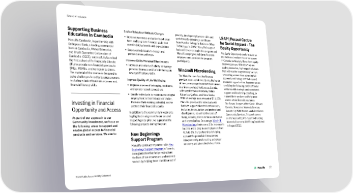 Financial Inclusion Supporting Business Enable Behaviour/Attitude Changes poverty, develop employment skills and LEAP | Pecaut Centre Education in Cambodia • Increase awareness and action to set short- work towards obtaining a certificate for Social Impact – The term and long-term financial goals that from Humber College in Business Office Equity Opportunity Manulife Cambodia, in partnership with meet individual needs and expectations Technology. In 2022, Manulife’s support Sathapana Bank, a leading commercial helped 30 women begin this program and The Equity Opportunity seeks to build an bank in Cambodia, Khmer Enterprise, • Empower individuals to design and Manulife employees led three financial equitable and resilient future for women and Credit Guarantee Corporation of pursue career pathways empowerment sessions for program in Canada, particularly those from equity- Cambodia (CGCC), successfully launched Increase Skills/Personal Effectiveness participants. deserving groups. With LEAP, we are the first cohort of I’m Financially Literate • Increase an individual’s ability to manage scaling innovative, high-impact solutions (IFL) to provide non-financial services to personal finances and/or help them gain Windmill Microlending that address the long-standing barriers SMEs, MSMEs, and women in business. new qualifications/skills preventing women from achieving full The material of the course is designed to The Manulife Loan Fund for Finance economic well-being, and that expand solve challenges faced by business owners Improve Quality of Life/Well-being provides loan capital directly into the hands economic opportunities. Together, we are including a lack of business acumen and of newcomers eager to restart their careers providing the following cohort of social financial literacy skills. • Improve a sense of belonging, resilience, in a finance-related field across Canada, ventures with strategic and operational and greater social connections with specific focus in Ontario, British support and leadership coaching, to • Enable individuals to maintain meaningful Columbia, Québec, and Nova Scotia. expand their services and help more employment in their industry of choice, With an average loan amount of $11,000, women attain financial resilience: Investing in Financial increase their earning potential, and/or Manulife provided 16 individuals with The Forum, Keepers of the Circle, NPower protect their financial security funds to support direct education costs, Canada, Newcomer Women’s Services Opportunity and Access including books, tuition and professional Toronto, Up With Women, and WoodGreen In addition to the community investments development, as well as the costs of Community Services. This work comes As part of our approach to our highlighted in alignment to our second living, allowing clients to focus on studies on the heels of LEAP’s report “Advancing Community Investment, we focus on Impact Agenda pillar, we supported the and accreditation. On average, Windmill Women’s Economic Well-Being” published the following areas to support and following projects during the year: Microlending clients see a 3.5x increase in in August 2022. enable global access to financial income and a drop in unemployment from products and services. We aim to: New Beginnings 41% to 8%. Our partnership is helping Support Program convert the potential of newcomers into prosperity and creating a stronger Manulife continues to partner with New economy and diversified labour force. Beginnings Support Program in Toronto, an organization that helps restructure the lives of low-income and underserved women by helping them transition out of 2022 Public Accountability Statement 12