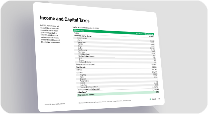 Income and Capital Taxes In 2022, Manulife incurred For the period ended December 31, 2022 $2.56 billion of taxes paid (C$ thousands) Total income and capital taxes or payable to all levels of Federal 553,611 governments globally of Provincial and territorial which $1.44 billion were paid or payable in income British Columbia 39,529 taxes and capital taxes and Alberta 26,065 $1.12 billion in other taxes. Saskatchewan 4,940 Manitoba 6,409 Ontario 222,522 Quebec 12,878 New Brunswick 5,481 Nova Scotia 13,220 Prince Edward Island 968 Newfoundland and Labrador 4,109 Yukon 218 Nunavut 202 Northwest Territories 355 Total provincial and territorial 336,895 Total Canada 890,506 Total U.S. 305,362 Total Asia 231,567 Hong Kong 103,906 Japan 45,568 Singapore 28,306 Mainland China 2 Vietnam 2,179 Rest of Asia 51,604 Taxes paid in other jurisdictions 8,353 Total income and capital taxes paid 1,435,788 Other Taxes1 1,120,336 Total taxes (C$ billions) 2.56 2022 Public Accountability Statement 1 Other taxes include property taxes, business taxes, payroll taxes, premium taxes, investment income taxes, and commodity taxes. 15