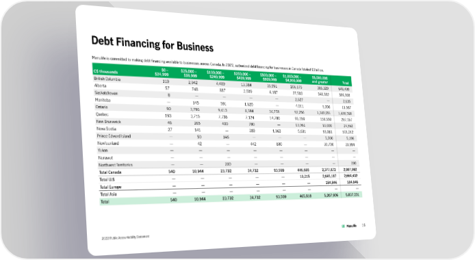 Debt Financing for Business Manulife is committed to making debt financing available to businesses across Canada. In 2022, authorized debt financing for businesses in Canada totaled $3 billion. $0 – $25,000 – $100,000 – $250,000 – $500,000 – $1,000,000 – $5,000,000 C$ thousands $24,999 $99,999 $249,999 $499,999 $999,999 $4,999,999 and greater Total British Columbia 119 2,042 4,409 13,384 35,951 206,175 386,329 648,409 Alberta 57 748 837 2,509 6,187 27,583 348,382 386,303 Saskatchewan 8 — — — — 2,627 — 2,635 Manitoba — 145 591 1,820 — 4,011 5,000 11,567 Ontario 90 3,796 9,413 8,384 34,778 92,256 1,340,051 1,488,768 Quebec 193 3,715 7,736 7,124 14,780 95,259 158,550 287,357 New Brunswick 46 265 400 780 — 13,061 10,000 24,552 Nova Scotia 27 141 — 289 1,063 5,631 93,861 101,012 Prince Edward Island — 50 146 — — — 5,000 5,196 Newfounland — 42 — 442 800 — 30,700 31,984 Yukon — — — — — — — — Nunawut — — — — — — — — Northwest Territories — — 200 — — — — 200 Total Canada 540 10,944 23,732 34,732 93,559 446,603 2,377,872 2,987,982 Total U.S — — — — — 19,215 2,645,187 2,664,402 Total Europe — — — — — — 184,846 184,846 Total Asia — — — — — — — — Total 540 10,944 23,732 34,732 93,559 465,818 5,207,906 5,837,231 2022 Public Accountability Statement 16