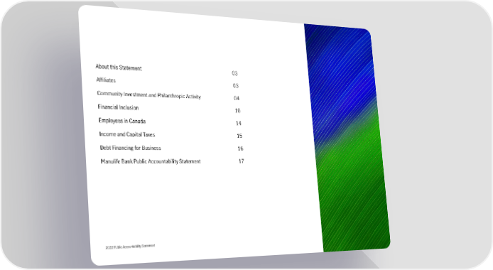 About this Statement 03 Affiliates 03 Community Investment and Philanthropic Activity 04 Financial Inclusion 10 Employees in Canada 14 Income and Capital Taxes 15 Debt Financing for Business 16 Manulife Bank Public Accountability Statement 17 2022 Public Accountability Statement
