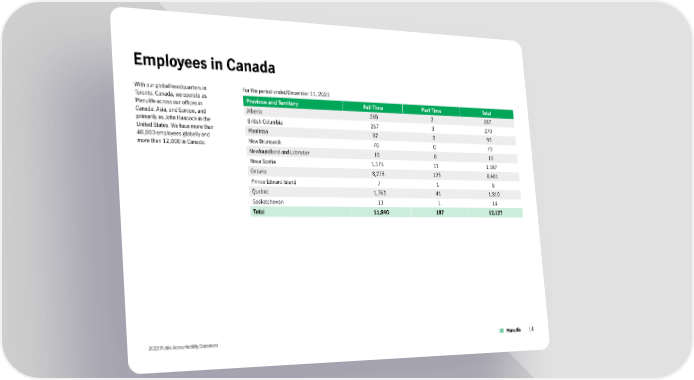Employees in Canada With our global headquarters in For the period ended December 31, 2022 Toronto, Canada, we operate as Province and Territory Full Time Part Time Total Manulife across our offices in Canada, Asia, and Europe, and Alberta 265 2 267 primarily as John Hancock in the British Columbia 267 3 270 United States. We have more than Manitoba 87 3 90 40,000 employees globally and New Brunswick 70 0 70 more than 12,000 in Canada. Newfoundland and Labrador 10 0 10 Nova Scotia 1,176 11 1,187 Ontario 8,276 125 8,401 Prince Edward Island 7 1 8 Quebec 1,769 41 1,810 Saskatchewan 13 1 14 Total 11,940 187 12,127 2022 Public Accountability Statement 14