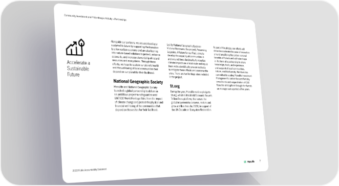 Community Investment and Philanthropic Activity > Partnerships Alongside our partners, we are accelerating a Led by National Geographic Explorer As part of the pledge, our efforts will sustainable future by supporting the transition Victoria Herrmann, the project, Preserving strive to accelerate the pace of innovation to a low carbon economy and are also leaning Legacies: A Future for our Past, aims to around amplifying the carbon removal into nature-based solutions to protect, enhance develop the capacity of communities in benefits of forests and will take shape access to, and increase stewardship of natural and around these landmarks to visualize in the form of a partnership to share resources and ecosystems. Through these climate impacts on a local scale and equip knowledge, tools, and experience, Accelerate a efforts, we hope to sustain our planet’s health them with scientifically proven methods and support of local communities, Sustainable and the well-being of local communities that to mitigate these effects and conserve the nature, and biodiversity. We have also depend on our planet for their livelihood. sites. There are ten heritage sites included committed to scaling Manulife Investment Future in the project. Management’s carbon-focused forestry National Geographic Society investments and sequestration of CO2 1t.org from the atmosphere through the forests Manulife and National Geographic Society we manage over a period of five years. launched a global partnership to deliver on During the year, Manulife made a pledge to an ambitious project to safeguard several 1t.org, which is the World Economic Forum’s UNESCO World Heritage Sites from the impact Trillion Trees platform, that serves the of climate change and protect the physical and global movement to conserve, restore and financial well-being of the communities that grow a trillion trees by 2030, in support of depend on those sites for their livelihood. the UN Decade on Ecosystem Restoration. 2022 Public Accountability Statement 7