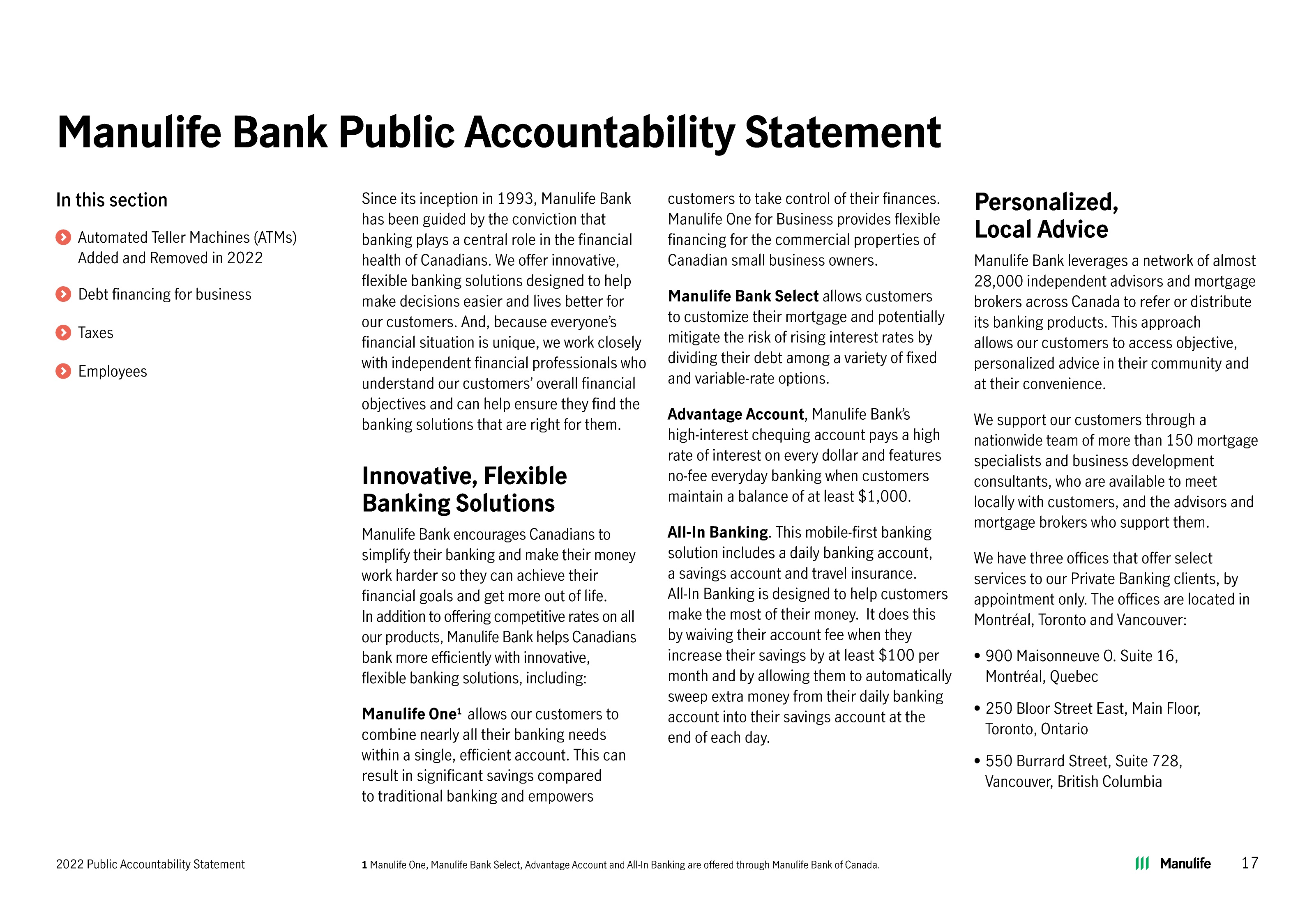 Manulife Bank Public Accountability Statement In this section Since its inception in 1993, Manulife Bank customers to take control of their finances. Personalized, has been guided by the conviction that Manulife One for Business provides flexible Local Advice Automated Teller Machines (ATMs) banking plays a central role in the financial financing for the commercial properties of Added and Removed in 2022 health of Canadians. We offer innovative, Canadian small business owners. Manulife Bank leverages a network of almost Debt financing for business flexible banking solutions designed to help 28,000 independent advisors and mortgage make decisions easier and lives better for Manulife Bank Select allows customers brokers across Canada to refer or distribute our customers. And, because everyone’s to customize their mortgage and potentially its banking products. This approach Taxes financial situation is unique, we work closely mitigate the risk of rising interest rates by allows our customers to access objective, Employees with independent financial professionals who dividing their debt among a variety of fixed personalized advice in their community and understand our customers’ overall financial and variable-rate options. at their convenience. objectives and can help ensure they find the Advantage Account, Manulife Bank’s banking solutions that are right for them. We support our customers through a high-interest chequing account pays a high nationwide team of more than 150 mortgage rate of interest on every dollar and features specialists and business development Innovative, Flexible no-fee everyday banking when customers consultants, who are available to meet Banking Solutions maintain a balance of at least $1,000. locally with customers, and the advisors and Manulife Bank encourages Canadians to All-In Banking. This mobile-first banking mortgage brokers who support them. simplify their banking and make their money solution includes a daily banking account, We have three offices that offer select work harder so they can achieve their a savings account and travel insurance. services to our Private Banking clients, by financial goals and get more out of life. All-In Banking is designed to help customers appointment only. The offices are located in In addition to offering competitive rates on all make the most of their money. It does this Montréal, Toronto and Vancouver: our products, Manulife Bank helps Canadians by waiving their account fee when they bank more efficiently with innovative, increase their savings by at least $100 per • 900 Maisonneuve O. Suite 16, flexible banking solutions, including: month and by allowing them to automatically Montréal, Quebec sweep extra money from their daily banking • 250 Bloor Street East, Main Floor, 1 Manulife One allows our customers to account into their savings account at the combine nearly all their banking needs end of each day. Toronto, Ontario within a single, efficient account. This can • 550 Burrard Street, Suite 728, result in significant savings compared Vancouver, British Columbia to traditional banking and empowers 2022 Public Accountability Statement 1 Manulife One, Manulife Bank Select, Advantage Account and All-In Banking are offered through Manulife Bank of Canada. 17