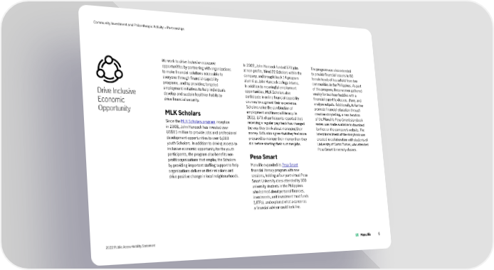 Community Investment and Philanthropic Activity > Partnerships We work to drive inclusive economic In 2022, John Hancock funded 570 jobs The program was also extended opportunities by partnering with organizations at non-profits, hired 22 Scholars within the to provide financial lessons to 50 to make financial solutions accessible to company, and brought back 14 program female heads of household from two everyone through financial capability alumni as John Hancock college interns. communities in the Philippines. As part programs, and by providing targeted In addition to meaningful employment of this program, these women gathered employment initiatives to help individuals opportunities, MLK Scholars also weekly for two-hour huddles with a Drive Inclusive develop and sustain healthier habits to participate in online financial capability financial expert to discuss, share, and Economic drive financial security. courses to augment their experience. analyze outputs. Additionally, to further Scholars value the combination of promote financial education through Opportunity MLK Scholars employment and financial literacy: In creative storytelling, a new iteration 2022, 87% of participants reported that of the Manulife Peso Smart storybook Since the MLK Scholars program inception receiving a regular paycheck has changed series was made available to download in 2008, John Hancock has invested over the way they think about managing their for free on the company’s website. The US$15 million to provide jobs and professional money. 84% also agree that they feel more latest installment of the storybook was development opportunities to over 6,000 prepared to manage their money than they created in collaboration with students of youth Scholars. In addition to driving access to did before starting their summer jobs. University of Santo Tomas, who attended inclusive economic opportunity for the youth Peso Smart University classes. participants, the program also benefits non- Peso Smart profit organizations that employ the Scholars by providing important staffing support to help Manulife expanded its Peso Smart organizations deliver on their missions and financial literacy program with new drive positive change in local neighbourhoods. sessions, holding a four-part virtual Peso Smart University class attended by 300 university students in the Philippines who learned about personal finances, investments, unit investment trust funds (UITFs), and explored what a career as a financial advisor could look like. 2022 Public Accountability Statement 6