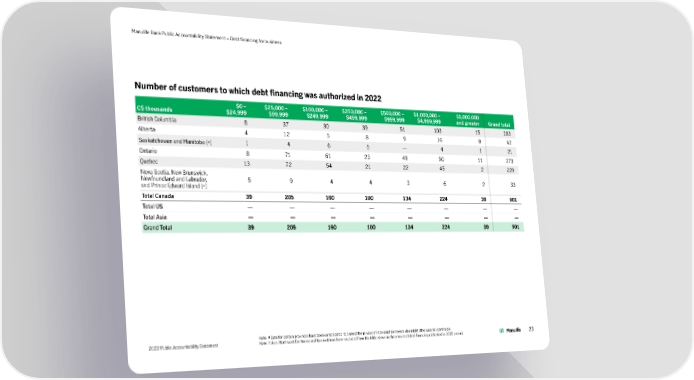 Manulife Bank Public Accountability Statement > Debt financing for business Number of customers to which debt financing was authorized in 2022 $0 – $25,000 – $100,000 – $250,000 – $500,000 – $1,000,000 – $5,000,000 C$ thousands $24,999 $99,999 $249,999 $499,999 $999,999 $4,999,999 and greater Grand total British Columbia 8 37 30 39 51 103 15 283 Alberta 4 12 5 8 9 16 8 62 Saskatchewan and Manitoba ( ) 1 4 6 5 — 4 1 21 * Ontario 8 71 61 23 49 50 11 273 Quebec 13 72 54 21 22 45 2 229 Nova Scotia, New Brunswick, Newfoundland and Labrador, 5 9 4 4 3 6 2 33 and Prince Edward Island (*) Total Canada 39 205 160 100 134 224 39 901 Total US — — — — — — — — Total Asia — — — — — — — — Grand Total 39 205 160 100 134 224 39 901 Note: *Data for certain provinces have been consolidated to protect the privacy of individual borrowers who might otherwise be identifiable. 2022 Public Accountability Statement Note: Yukon, Northwest Territories and Nunavut have been excluded from the table above as the amount of debt financing authorized in 2022 was nil. 23