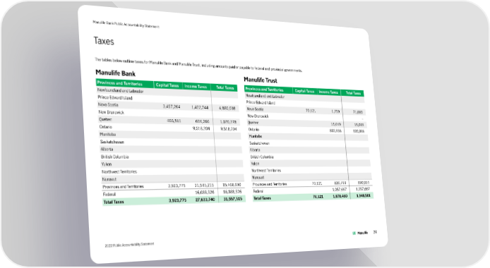 Manulife Bank Public Accountability Statement Taxes The tables below outline taxes for Manulife Bank and Manulife Trust, including amounts paid or payable to federal and provincial governments. Manulife Bank Manulife Trust Provinces and Territories Capital Taxes Income Taxes Total Taxes Provinces and Territories Capital Taxes Income Taxes Total Taxes Newfoundland and Labrador Newfoundland and Labrador Prince Edward Island Prince Edward Island Nova Scotia 3,457,264 1,422,744 4,880,008 Nova Scotia 70,121 1,759 71,880 New Brunswick New Brunswick – Quebec 466,511 604,266 1,070,778 Quebec 15,049 15,049 Ontario 9,518,204 9,518,204 Ontario 803,986 803,986 Manitoba Manitoba Saskatchewan Saskatchewan Alberta Alberta British Columbia British Columbia Yukon Yukon Northwest Territories Northwest Territories Nunavut Nunavut Provinces and Territories 3,923,775 11,545,215 15,468,990 Provinces and Territories 70,121 820,793 890,914 Federal 16,088,526 16,088,526 Federal 1,057,667 1,057,667 Total Taxes 3,923,775 27,633,740 31,557,515 Total Taxes 70,121 1,878,460 1,948,581 2022 Public Accountability Statement 24