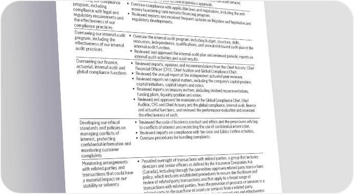 Key responsibilities Key activities Overseeing the performance, • Considered auditor tenure and the engagement of the external auditors, qualifications and including the planned initiation of a tendering process for the external audit independence of our external engagement once the adoption of IFRS 17 and first annual audit cycle is auditors complete. • Conducted the annual review of Ernst & Young, including the engagement partner and audit team, their independence, objectivity and quality of audit work performed, and recommended their reappointment as auditors to the board for approval. • Reviewed and approved or pre-approved the auditor independence policy, the scope of the annual audit plan and all related services and fees, recurring audit and non-audit services for the coming year, and audit and non-audit services proposed during the year outside of previous approvals. Overseeing our compliance • Oversaw compliance with applicable laws and regulations, including the anti- program, including money laundering/anti-terrorist financing program. compliance with legal and • Reviewed reports and received frequent updates on litigation and legislative and regulatory requirements and regulatory developments. the effectiveness of our compliance practices Overseeing our internal audit • Oversaw the internal audit program, including budget, structure, skills, program, including the resources, independence, qualifications, and annual risk-based audit plan of the effectiveness of our internal internal audit function. audit practices • Reviewed and approved the internal audit plan and reviewed periodic reports on internal audit activities and audit results. Overseeing our finance, • Reviewed reports, opinions and recommendations from the Chief Actuary, Chief actuarial, internal audit and Financial Officer (CFO), Chief Auditor and Global Compliance Chief. global compliance functions • Reviewed the annual report of the independent actuarial peer reviewer. • Reviewed reports on capital matters, including the company’s capital position, capital initiatives, capital targets and ratios. • Reviewed reports on treasury matters, including dividend recommendations, funding plans, liquidity position and ratios. • Reviewed and approved the mandates of the Global Compliance Chief, Chief Auditor, CFO and Chief Actuary and the global compliance, internal audit, finance and actuarial functions, and reviewed the performance evaluation and assessed the effectiveness of each. Developing our ethical • Reviewed the code of business conduct and ethics and the procedures relating standards and policies on to conflicts of interest and restricting the use of confidential information. managing conflicts of • Reviewed reports on compliance with the code and Ethics Hotline activities. interest, protecting • Oversaw procedures for handling complaints. confidential information and monitoring customer complaints Monitoring arrangements • Provided oversight of transactions with related parties, a group that includes with related parties and directors and senior officers as defined by the Insurance Companies Act transactions that could have (Canada), including through the committee-approved related party transactions a material impact on our policy, which includes established procedures to ensure the disclosure and stability or solvency review of related party transactions and that apply to a broad range of transactions with related parties, from the provision of products or services to a related party to the purchase of assets or services from a related party. • Reviewed reports on the company’s related party procedures and effectiveness of the procedures to identify material related party transactions and ensure any related party transactions comply with all requirements. The committee meets without management present at each meeting. The committee also met in private with Ernst & Young, the independent actuarial peer reviewer, CFO, Chief Risk Officer, Chief Actuary, Chief Auditor and Global Compliance Chief throughout the year. 32 Manulife Financial Corporation