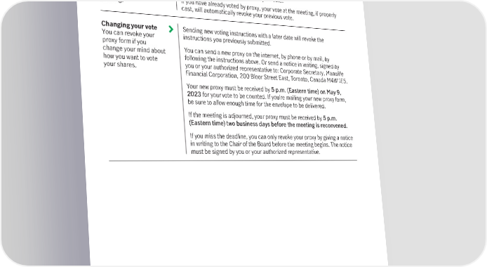Registered shareholders and non-registered ownership statement holders (continued) Vote online during the On the day of the meeting: meeting 1. Log in: https://web.lumiagm.com/467771061. The link will be You will find your control accessible one hour before the meeting start time to allow you to number on the proxy form test your connection included with your 2. Click “I have a control number” meeting materials. 3. Enter your control number (on the proxy form included with the You will need your control meeting materials) 4. Enter your password: “manulife2023” (case sensitive) number to be able to vote 5. Follow the instructions to cast your vote. or ask questions at the If you have already voted by proxy, your vote at the meeting, if properly meeting. cast, will automatically revoke your previous vote. Changing your vote Sending new voting instructions with a later date will revoke the You can revoke your instructions you previously submitted. proxy form if you You can send a new proxy on the internet, by phone or by mail, by change your mind about following the instructions above. Or send a notice in writing, signed by how you want to vote you or your authorized representative to: Corporate Secretary, Manulife your shares. Financial Corporation, 200 Bloor Street East, Toronto, Canada M4W 1E5. Your new proxy must be received by 5 p.m. (Eastern time) on May 9, 2023 for your vote to be counted. If you’re mailing your new proxy form, be sure to allow enough time for the envelope to be delivered. If the meeting is adjourned, your proxy must be received by 5 p.m. (Eastern time) two business days before the meeting is reconvened. If you miss the deadline, you can only revoke your proxy by giving a notice in writing to the Chair of the Board before the meeting begins. The notice must be signed by you or your authorized representative. 8 Manulife Financial Corporation