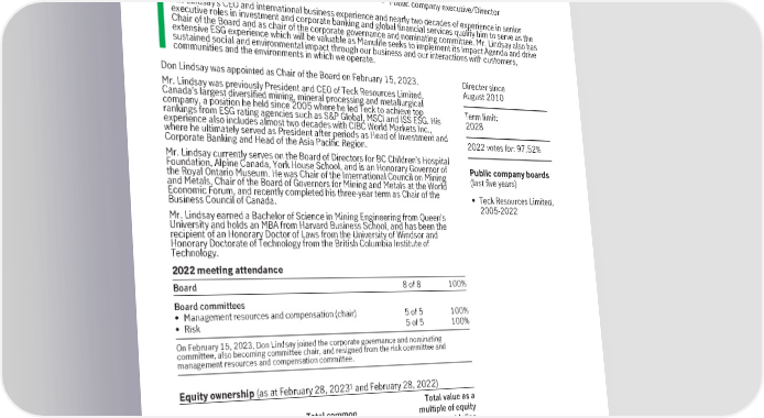 Director profiles Donald R. Lindsay (Chair) Vancouver, BC, Canada/Age 64/Independent Key competencies and experience • Finance/Accounting • Technology/Operations • Risk management • Asia experience • Talent management/Executive compensation • Public company executive/Director Mr. Lindsay’s CEO and international business experience and nearly two decades of experience in senior executive roles in investment and corporate banking and global financial services qualify him to serve as the Chair of the Board and as chair of the corporate governance and nominating committee. Mr. Lindsay also has extensive ESG experience which will be valuable as Manulife seeks to implement its Impact Agenda and drive sustained social and environmental impact through our business and our interactions with customers, communities and the environments in which we operate. Don Lindsay was appointed as Chair of the Board on February 15, 2023. Director since Mr. Lindsay was previously President and CEO of Teck Resources Limited, August 2010 Canada’s largest diversified mining, mineral processing and metallurgical company, a position he held since 2005 where he led Teck to achieve top Term limit: rankings from ESG rating agencies such as S&P Global, MSCI and ISS ESG. His 2028 experience also includes almost two decades with CIBC World Markets Inc., where he ultimately served as President after periods as Head of Investment and 2022 votes for: 97.52% Corporate Banking and Head of the Asia Pacific Region. Mr. Lindsay currently serves on the Board of Directors for BC Children’s Hospital Foundation, Alpine Canada, York House School, and is an Honorary Governor of Public company boards the Royal Ontario Museum. He was Chair of the International Council on Mining (last five years) and Metals, Chair of the Board of Governors for Mining and Metals at the World Economic Forum, and recently completed his three-year term as Chair of the • Teck Resources Limited, Business Council of Canada. 2005-2022 Mr. Lindsay earned a Bachelor of Science in Mining Engineering from Queen’s University and holds an MBA from Harvard Business School, and has been the recipient of an Honorary Doctor of Laws from the University of Windsor and Honorary Doctorate of Technology from the British Columbia Institute of Technology. 2022 meeting attendance Board 8 of 8 100% Board committees • Management resources and compensation (chair) 5 of 5 100% • Risk 5 of 5 100% On February 15, 2023, Don Lindsay joined the corporate governance and nominating committee, also becoming committee chair, and resigned from the risk committee and management resources and compensation committee. Equity ownership (as at February 28, 20231 and February 28, 2022) Total value as a Common Total common multiple of equity Year shares DSUs shares and DSUs Total value ownership guideline 2023 20,000 108,672 128,672 $3,471,571 3.3x 2022 20,000 96,046 116,046 $2,980,061 3.8x Change 0 12,626 12,626 1 As of March 15, 2023, Mr. Lindsay increased his personal MFC common share holdings to 120,000 shares, bringing his total equity holdings to 228, 672. The total value of his holdings, based on the closing price of our common shares on the TSX on February 28, 2023, was $6,169,570. With the changes to director compensation that went into effect January 1, 2023, the equity ownership requirement increased to $1,041,089 (US$765,000). The total value as a multiple of equity ownership guideline shown above relates to the guideline in effect for each respective year. See page 5 for information about equity ownership 18 Manulife Financial Corporation