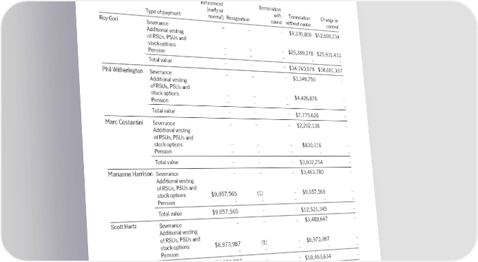 Termination and change in control The table below shows the estimated amounts that would be provided to each named executive if employment is terminated under five different scenarios, assuming the scenario took place on December 31, 2022. The actual amounts will depend on our share price at the time as well as other variables, such as the named executive’s age and years of service. The information below is shown in Canadian dollars. Amounts for our named executives compensated in U.S. dollars have been converted using the average 2022 exchange rate of US$1.00 = $1.3015. Retirement Termination (early or with Termination Change in Type of payment normal) Resignation cause without cause control Roy Gori Severance – – – $9,370,800 $12,669,734 Additional vesting of RSUs, PSUs and stock options – – – $25,389,278 $25,931,433 Pension – – – – – Total value – – – $34,760,078 $38,601,167 Phil Witherington Severance – – – $3,348,750 – Additional vesting of RSUs, PSUs and stock options – – – $4,426,876 – Pension – – – – – Total value – – – $7,775,626 – Marc Costantini Severance – – – $2,202,138 – Additional vesting of RSUs, PSUs and stock options – – – $830,116 – Pension – – – – – Total value – – – $3,032,254 – Marianne Harrison Severance – – – $3,463,780 – Additional vesting of RSUs, PSUs and stock options $9,057,565 (1) – $9,057,565 – Pension – – – – – Total value $9,057,565 – – $12,521,345 – Scott Hartz Severance – – – $3,489,647 – Additional vesting of RSUs, PSUs and stock options $6,973,987 (1) – $6,973,987 – Pension – – – – – Total value $6,973,987 – – $10,463,634 – (1) Ms. Harrison and Mr. Hartz have met certain age and service criteria for additional vesting of equity upon a resignation with prescribed advanced written notice. For purposes of this disclosure, such resignations are referred to as “Retirement”. Equity-based awards are treated according to the terms and conditions of the award agreements and plan documents unless the named executive has entered into an agreement that indicates otherwise. See the next page for information about Mr. Gori’s change in control agreement and employment agreement. The amount shown for additional vesting of RSUs, PSUs and stock options is the estimated value that would be payable under each termination scenario, and is based on $24.15, the closing price of Manulife common shares on the TSX on December 31, 2022. The value of performance share units is calculated assuming a performance factor of 100%. 98 Manulife Financial Corporation