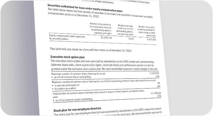 Executive Compensation Canadian executives can no longer exchange restricted share units and performance share units that are granted after 2015, in accordance with a change in Canadian tax rulings. Instead, to promote longer term equity ownership, Canadian executives can choose to receive deferred share units instead of restricted share units as long as they make this choice prior to the grant. About the deferred compensation account Some U.S. executives can defer up to 90% of their base salary and some or all of their annual incentive and vested restricted share units into a deferred compensation account. The money must remain in the account for at least three years and is adjusted as though the funds had been invested in one or more investment options designated by Manulife and selected by the executive. On withdrawal, the executive can take the cash either in a lump sum or in annual instalments. Securities authorized for issue under equity compensation plans The table below shows the total number of securities to be issued and available for issue under our equity compensation plans as at December 31, 2022: Number of securities to Weighted average Number of securities be issued upon exercise of exercise price of remaining available for of outstanding options, outstanding options, future issuance under warrants and rights warrants and rights equity plans Equity compensation plans approved 20,196,742 22.42 6,475,414 by security holders This table tells you about our plans and their status as at December 31, 2022: Executive stock option plan The executive stock option plan was approved by shareholders at the 2000 annual and special meeting. Deferred share units, share appreciation rights, restricted shares and performance awards can also be granted under the executive stock option plan. We need shareholder approval to make changes to the plan. Maximum number of common shares that may be issued 73,600,000 • as a % of common shares outstanding 3.9% Maximum number of common shares that may be issued (% of outstanding common shares that cannot be exceeded) • to any one participant, or 5% • to insiders as a whole 10% Total number of common shares that have been issued in respect of stock options and deferred share units 47,199,528 • as a % of common shares outstanding 2.5% Stock plan for non-employee directors The stock plan for non-employee directors was approved by shareholders at the 2001 annual and special meeting. Deferred share units can also be granted under the stock plan. We need shareholder approval to make changes to the plan. Maximum number of common shares that may be issued 1,000,000 • as a % of common shares outstanding less than 0.1% Maximum number of common shares that may be issued (% of outstanding common shares that cannot be exceeded) • to any one participant, or 5% • to insiders as a whole 10% Total number of common shares that have been issued in respect of deferred share units 728,316 • as a % of common shares outstanding less than 0.1% 2023 Management information circular 91