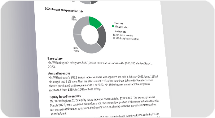2022 compensation mix 21% RSUs Fixed pay 18% Base salary Variable pay 29% Annual incentive 53% Equity-based incentives 32% PSUs 2023 target compensation mix 25% RSUs Fixed pay 15% Base salary Variable pay 23% Annual incentive 62% Equity-based incentives 37% PSUs Base salary Mr. Witherington’s salary was $950,000 in 2022 and was increased to $975,000 effective March 1, 2023. Annual incentive Mr. Witherington’s 2022 annual incentive award was approved and paid in February 2023. It was 122% of his target and 31% lower than his 2021 award. 10% of the award was delivered in Manulife common shares purchased on the open market. For 2023, Mr. Witherington’s annual incentive target was increased from 135% to 150% of base salary. Equity-based incentives Mr. Witherington’s 2022 equity-based incentive awards totaled $2,800,000. The awards, granted in March 2022, were based on his performance, the competitive position of his compensation compared to our compensation peer group and the board’s focus on aligning executive pay with the interests of our shareholders. In February 2023, the board approved $4,000,000 in equity-based incentives for Mr. Witherington and allocated 60% to performance share units and 40% to restricted share units. These awards are intended to be forward-looking. The actual amount Mr. Witherington realizes will be greater or less than the theoretical grant date amount based on our share price at the time of vesting and Manulife’s financial performance over the next three years. 74 Manulife Financial Corporation