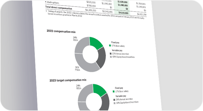 Executive Compensation TOTAL DIRECT COMPENSATION The table below shows the total direct compensation the board approved for Ms. Harrison for 2022 and for her base salary and equity-based incentives for 2023, based on the recommendation of the CEO and the management resources and compensation committee. (US$) 2020 2021 2022 2023 Base salary $740,000 $740,000 $755,000 $775,000 1 Annual incentive $965,000 $1,702,000 $1,064,000 $1,046,250 (target) Equity-based incentives1 • PSUs $1,300,000 $1,560,000 $1,620,000 $1,560,000 • RSUs $520,000 $1,040,000 $1,080,000 $1,040,000 • stock options $780,000 $0 $0 $0 Total direct compensation $4,305,000 $5,042,000 $4,519,000 $4,421,250 1 Timing of awards: the 2022 column includes the annual incentive awarded for 2022 and paid in February 2023 and the equity- based incentives granted in March 2022 2022 compensation mix 24% RSUs Fixed pay 17% Base salary Variable pay 23% Annual incentive 60% Equity-based incentives 36% PSUs 2023 target compensation mix 24% RSUs Fixed pay 17% Base salary Variable pay 24% Annual incentive 59% Equity-based incentives 35% PSUs 2023 Management information circular 79