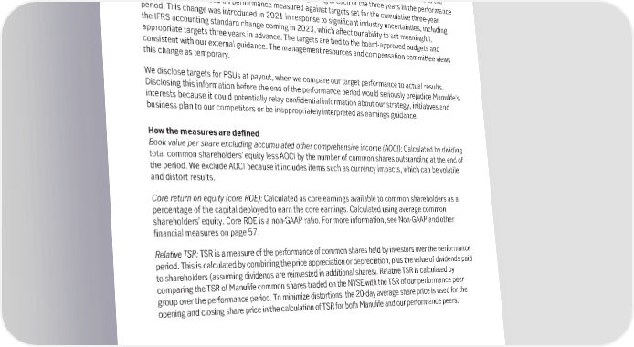 Executive Compensation Relative TSR uses a three-year performance period but is used to adjust the performance factor rather than a separate performance condition. This emphasizes conditions that are more directly controllable by management while continuing to have TSR and our share price meaningfully affect the payout value over a three-year period. The board can modify the calculated result when significant events outside management’s control make awards unreasonable, unrepresentative or inappropriate. The board also believes management should not be penalized for making decisions that are in the long-term best interests of shareholders. The performance factors for 2022 grants are determined as an average of performance relative to the threshold, target and maximum targets set at the beginning of each of the three years in the performance period, instead of based on performance measured against targets set for the cumulative three-year period. This change was introduced in 2021 in response to significant industry uncertainties, including the IFRS accounting standard change coming in 2023, which affect our ability to set meaningful, appropriate targets three years in advance. The targets are tied to the board-approved budgets and consistent with our external guidance. The management resources and compensation committee views this change as temporary. We disclose targets for PSUs at payout, when we compare our target performance to actual results. information before the end of the performance period would seriously prejudice Manulife’s Disclosing this interests because it could potentially relay confidential information about our strategy, initiatives and business plan to our competitors or be inappropriately interpreted as earnings guidance. How the measures are defined Book value per share excluding accumulated other comprehensive income (AOCI): Calculated by dividing total common shareholders’ equity less AOCI by the number of common shares outstanding at the end of the period. We exclude AOCI because it includes items such as currency impacts, which can be volatile and distort results. Core return on equity (core ROE): Calculated as core earnings available to common shareholders as a percentage of the capital deployed to earn the core earnings. Calculated using average common shareholders’ equity. Core ROE is a non-GAAP ratio. For more information, see Non-GAAP and other financial measures on page 57. Relative TSR: TSR is a measure of the performance of common shares held by investors over the performance period. This is calculated by combining the price appreciation or depreciation, plus the value of dividends paid to shareholders (assuming dividends are reinvested in additional shares). Relative TSR is calculated by comparing the TSR of Manulife common shares traded on the NYSE with the TSR of our performance peer group over the performance period. To minimize distortions, the 20-day average share price is used for the opening and closing share price in the calculation of TSR for both Manulife and our performance peers. 2023 Management information circular 63
