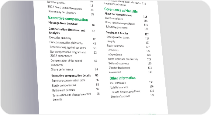 Where to find it About the meeting Compensation oversight 103 Who can vote 6 How the board oversees executive 103 How to vote 7 compensation What the meeting will cover 12 Managing compensation risk 105 About the directors The decision-making process 108 Compensation of employees who have a 110 Key things about the board 16 material impact on risk Director profiles 18 Governance at Manulife 2022 board committee reports 30 About the Manulife board 115 How we pay our directors 35 Board committees 118 Executive compensation Board roles and responsibilities 118 Message from the Chair 40 Subsidiary governance 126 Compensation discussion and 42 Serving as a director 127 Analysis Serving on other boards 127 Executive summary 42 Integrity 127 Our compensation philosophy 48 Equity ownership 127 Benchmarking against our peers 50 Term limits 127 Our compensation program and 52 Independence 128 2022 performance Board succession and diversity 129 Compensation of the named 67 Skills and experience 130 executives Share performance 84 Director development 132 Assessment 133 Executive compensation details 86 Other information Summary compensation table 86 Equity compensation 88 ESG at Manulife 135 Retirement benefits 92 Liability insurance 136 Termination and change in control 98 Loans to directors and officers 136 benefits Directors’ approval 136 This symbol tells you where you can find more information 4 Manulife Financial Corporation
