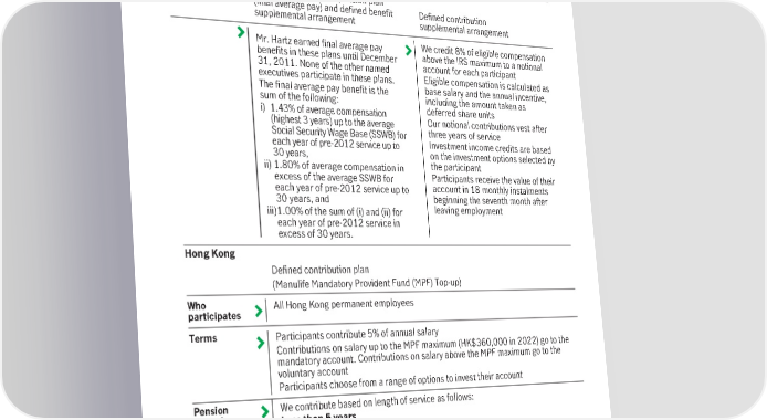 Executive Compensation Defined benefit pension plan (cash balance) 401(k) plan Retirement Normal retirement is 65, but benefits Participants receive the value of their can be paid at any retirement age based account when they leave employment on the value of the participant’s account or if they become permanently disabled on the date their pension begins Payments are normally made as a life annuity, but participants can choose a lump sum or other payment option Closed defined benefit pension plan (final average pay) and defined benefit Defined contribution supplemental arrangement supplemental arrangement Mr. Hartz earned final average pay We credit 8% of eligible compensation benefits in these plans until December above the IRS maximum to a notional 31, 2011. None of the other named account for each participant executives participate in these plans. Eligible compensation is calculated as The final average pay benefit is the base salary and the annual incentive, sum of the following: including the amount taken as i) 1.43% of average compensation deferred share units (highest 3 years) up to the average Our notional contributions vest after Social Security Wage Base (SSWB) for three years of service each year of pre-2012 service up to Investment income credits are based 30 years, on the investment options selected by ii) 1.80% of average compensation in the participant excess of the average SSWB for Participants receive the value of their each year of pre-2012 service up to account in 18 monthly instalments 30 years, and beginning the seventh month after iii)1.00% of the sum of (i) and (ii) for leaving employment each year of pre-2012 service in excess of 30 years. Hong Kong Defined contribution plan (Manulife Mandatory Provident Fund (MPF) Top-up) Who All Hong Kong permanent employees participates Terms Participants contribute 5% of annual salary Contributions on salary up to the MPF maximum (HK$360,000 in 2022) go to the mandatory account. Contributions on salary above the MPF maximum go to the voluntary account Participants choose from a range of options to invest their account Pension We contribute based on length of service as follows: formula Less than 5 years 5% of annual salary 5 to 10 years 7.5% of annual salary More than 10 years 10% of annual salary All our contributions, other than the first 5% of annual salary up to the MPF maximum, go to the voluntary account Our contributions to the mandatory account vest immediately Our contributions to the voluntary account vest on a sliding scale based on length of service that grades by 10% per year starting at 30% after three years to 100% after 10 years Retirement Participants can receive the value of the voluntary account at any time but can receive the value of the mandatory account only after age 60 2023 Management information circular 97