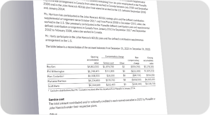 DEFINED CONTRIBUTION PENSION PLAN TABLE Mr. Gori has participated in the Manulife defined contribution plan and supplemental arrangement in Canada since June 2017. Mr. Gori had participated in the Manulife Mandatory Provident Fund Top-up in Hong Kong from March 2015 to May 2017 prior to becoming President and CEO. Mr. Witherington has participated in the Manulife defined contribution plan and supplemental arrangement in Canada since January 2018. Mr. Witherington had participated in the Manulife Mandatory Provident Fund Top-up in Hong Kong from May 2014 to December 2017 prior to becoming Chief Financial Officer. Mr. Costantini participates in the John Hancock 401(k) plan and the defined contribution supplemental arrangement in the U.S. Mr. Costantini has benefits remaining from his prior employment in the Manulife supplemental arrangement in Canada from when he worked in Canada between July 1990 and September 2000 and in the John Hancock 401(k) plan from when he worked in the U.S. between September 2000 and January 2014. Ms. Harrison has participated in the John Hancock 401(k) savings plan and the defined contribution supplemental arrangement since October 2017 and from March 2008 to December 2012, when she worked in the U.S. She previously participated in the Manulife defined contribution plan and supplemental defined contribution arrangement in Canada from January 2013 to September 2017 and September 2002 to February 2008, when she worked in Canada. Mr. Hartz participate in the John Hancock 401(k) plan and the defined contribution supplemental arrangement in the U.S. The table below is a reconciliation of the account balances from December 31, 2021 to December 31, 2022: Opening Compensatory change Non- Closing accumulated compensatory accumulated value Service cost Other change value Roy Gori $4,863,500 $1,074,700 $0 ($559,700) $5,378,500 Phil Witherington $1,748,400 $311,800 $0 ($231,000) $1,829,200 1 Marc Costantini $1,008,900 $10,000 $0 ($84,700) $934,200 Marianne Harrison $4,234,400 $239,700 $0 ($408,500) $4,065,600 Scott Hartz $4,164,600 $252,400 $0 ($308,300) $4,108,700 1 Excludes distributions that Mr. Costantini received after his departure from Manulife in January 2014. Service cost The total amount contributed and/or notionally credited to each named executive in 2022 by Manulife or John Hancock under their respective plans. Other The impact of any plan amendments. Non-compensatory change Includes any contributions made by the named executives, all investment income credited during the year and any amounts due to currency fluctuations. 94 Manulife Financial Corporation
