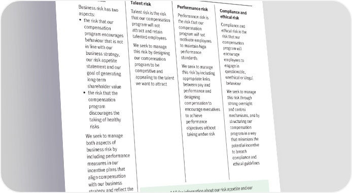 Executive Compensation Managing compensation risk Compensation is aligned with the company’s risk appetite and risk management objectives, and discourages inappropriate risk taking. We use a compensation risk framework to structure how we manage the risks associated with the compensation program and the design features that mitigate these risks. The framework includes four categories, which shape the development of our compensation program. We assess our compensation program against the framework every year. Business risk Talent risk Performance risk Compliance and Business risk has two Talent risk is the risk Performance risk is ethical risk aspects: that our compensation the risk that our Compliance and • the risk that our program will not compensation ethical risk is the compensation attract and retain program will not risk that our program encourages talented employees motivate employees compensation behaviour that is not We seek to manage to maintain high program will in line with our this risk by designing performance encourage business strategy, our compensation standards employees to our risk appetite program to be We seek to manage engage in statement and our competitive and this risk by including questionable, goal of generating appealing to the talent appropriate links unethical or illegal long-term we want to attract between pay and behaviour shareholder value performance and We seek to manage • the risk that the designing this risk through compensation compensation to strong oversight program encourage executives and control discourages the to achieve mechanisms, and by taking of healthy performance structuring our risks objectives without compensation We seek to manage taking undue risk program in a way both aspects of that minimizes the business risk by potential incentive including performance to breach measures in our compliance and incentive plans that ethical guidelines align compensation with our business strategy and reflect the impact employees have See page 119 for information about our risk appetite and our on performance enterprise risk management framework 2023 Management information circular 105