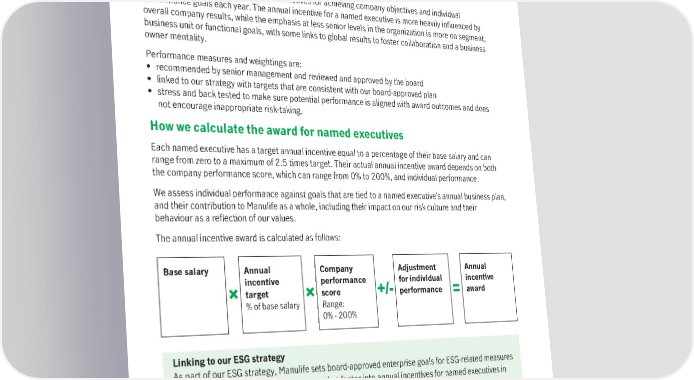 About base salaries Base salaries are set in February of each year and any changes go into effect on March 1. Each named executive’s salary depends on several considerations, including qualifications, experience in the role, performance, career progression, salaries paid for comparable roles at peer companies and salaries of comparable roles within Manulife. We benchmark salaries at least once a year against comparable roles at peer companies. About our annual incentive Our annual incentive rewards named executives for achieving company objectives and individual performance goals each year. The annual incentive for a named executive is more heavily influenced by overall company results, while the emphasis at less senior levels in the organization is more on segment, business unit or functional goals, with some links to global results to foster collaboration and a business owner mentality. Performance measures and weightings are: • recommended by senior management and reviewed and approved by the board • linked to our strategy with targets that are consistent with our board-approved plan • stress and back tested to make sure potential performance is aligned with award outcomes and does not encourage inappropriate risk-taking. How we calculate the award for named executives Each named executive has a target annual incentive equal to a percentage of their base salary and can range from zero to a maximum of 2.5 times target. Their actual annual incentive award depends on both the company performance score, which can range from 0% to 200%, and individual performance. We assess individual performance against goals that are tied to a named executive’s annual business plan, and their contribution to Manulife as a whole, including their impact on our risk culture and their behaviour as a reflection of our values. The annual incentive award is calculated as follows: Base salary Annual Company Adjustment Annual incentive performance for individual incentive target score performance award % of base salary Range: 0% -200% Linking to our ESG strategy As part of our ESG strategy, Manulife sets board-approved enterprise goals for ESG-related measures that are key to our business strategy and that factor into annual incentives for named executives in two ways: • The strategic focus component of the company performance score is based in part on an assessment of performance against goals linked to diversity, equity and inclusion, climate action, employee engagement and customer satisfaction • The individual performance goals for each named executive also include goals linked to diversity, equity and inclusion, climate action, employee engagement and leadership accountability, as well as risk goals related to cybersecurity and ethical business conduct (see the named executive profiles starting on page 67). We review the ESG-related goals every year to make sure executive compensation continues to support Manulife’s ESG priorities and ensure leadership accountability to drive positive change. 54 Manulife Financial Corporation