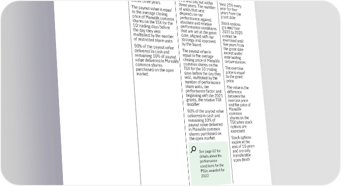 Executive Compensation Equity-based incentives Restricted share units Performance share units Stock options What they Notional shares that pay Notional shares that pay Rights to buy are out based on the price of out based on our Manulife Manulife common shares performance and on the common shares price of Manulife in the future at common shares a specified price Vesting and Vest and pay out Vest and pay out within Vest 25% every payout within three years three years. The number year for four The payout value is equal of units that vest years from the to the average closing depends on our grant date price of Manulife common performance against Stock options shares on the TSX for the absolute and relative granted from 10 trading days before performance conditions 2015 to 2020 the day they vest that are set at the grant cannot be multiplied by the number date, aligned with our exercised until of restricted share units strategy and approved five years from by the board the grant date 90% of the payout value The payout value is except under delivered in cash and equal to the average extenuating remaining 10% of payout closing price of Manulife circumstances value delivered in Manulife commonsharesonthe common shares TSX for the 10 trading The exercise purchased on the open days before the day they price is equal market vest, multiplied by the to the grant number of performance price share units, the The value is the performance factor and difference beginning with the 2021 between the grants, the relative TSR exercise price modifier and the price of 90% of the payout value Manulife delivered in cash and common remaining 10% of shares on the payout value delivered TSX when stock in Manulife common options are shares purchased on exercised the open market Stock options expire at the See page 62 for end of 10 years and are only details about the transferable performance upon death conditions for the PSUs awarded for 2022 2023 Management information circular 61