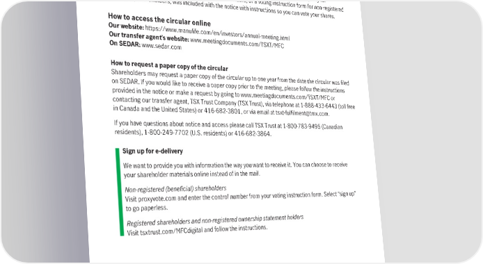 Delivery of the 2023 management information circular As permitted by the Canadian Securities Administrators and pursuant to an exemption from the proxy solicitation requirement received from the Office of the Superintendent of Financial Institutions Canada, we are using notice and access to deliver this circular to both our registered and non-registered (beneficial) shareholders. What is notice and access? Instead of receiving a paper copy of the circular, a package was sent to shareholders with a notice explaining how to access the circular online and how to request a paper copy. A form of proxy for registered shareholders and ownership statement holders, or a voting instruction form for non-registered (beneficial) shareholders, was included with the notice with instructions so you can vote your shares. How to access the circular online Our website: https://www.manulife.com/en/investors/annual-meeting.html Our transfer agent’s website: www.meetingdocuments.com/TSXT/MFC On SEDAR: www.sedar.com How to request a paper copy of the circular Shareholders may request a paper copy of the circular up to one year from the date the circular was filed on SEDAR. If you would like to receive a paper copy prior to the meeting, please follow the instructions provided in the notice or make a request by going to www.meetingdocuments.com/TSXT/MFC or contacting our transfer agent, TSX Trust Company (TSX Trust), via telephone at 1-888-433-6443 (toll free in Canada and the United States) or 416-682-3801, or via email at [email protected]. If you have questions about notice and access please call TSX Trust at 1-800-783-9495 (Canadian residents), 1-800-249-7702 (U.S. residents) or 416-682-3864. Sign up for e-delivery We want to provide you with information the way you want to receive it. You can choose to receive your shareholder materials online instead of in the mail. Non-registered (beneficial) shareholders Visit proxyvote.com and enter the control number from your voting instruction form. Select “sign up” to go paperless. Registered shareholders and non-registered ownership statement holders Visit tsxtrust.com/MFCdigital and follow the instructions. 2023 Management information circular 3