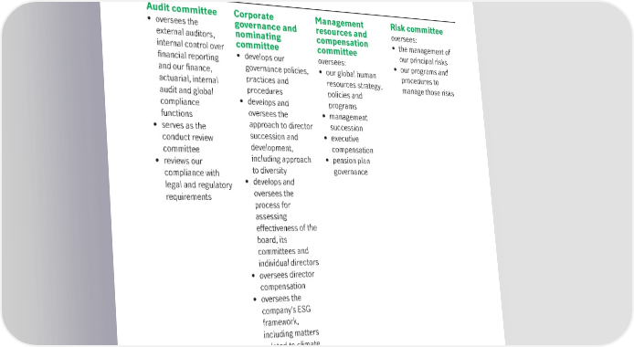 Governance at Manulife Chair of the Board provides independent board leadership and oversight Board of directors oversees: • culture of integrity and ethics • corporate governance • strategic planning • internal controls • risk management • communications and public disclosure • leadership development and succession planning Audit committee Corporate Management Risk committee • oversees the governance and resources and oversees: external auditors, nominating compensation • the management of internal control over committee committee our principal risks financial reporting • develops our oversees: • our programs and and our finance, governance policies, • our global human procedures to actuarial, internal practices and resources strategy, manage those risks audit and global procedures policies and compliance • develops and programs functions oversees the • management • serves as the approach to director succession conduct review succession and • executive committee development, compensation • reviews our including approach • pension plan compliance with to diversity governance legal and regulatory • develops and requirements oversees the process for assessing effectiveness of the board, its committees and individual directors • oversees director compensation • oversees the company’s ESG framework, including matters related to climate change Management • reports to the committees and the board • control functions such as finance, risk, compliance and internal audit operate independently of the business units 2023 Management information circular 117