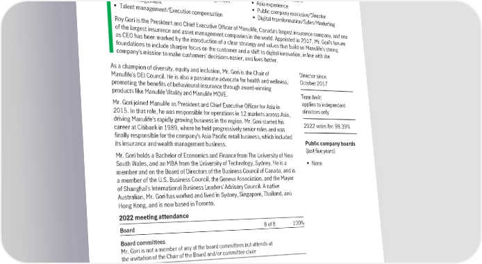 About the Directors Roy Gori (President and Chief Executive Officer) Toronto, ON, Canada/Age 53/Not independent (management) Key competencies and experience • Finance/Accounting • Technology/Operations • Insurance/Reinsurance/Investment management • Asia experience • Risk management • Public company executive/Director • Talent management/Executive compensation • Digital transformation/Sales/Marketing Roy Gori is the President and Chief Executive Officer of Manulife, Canada’s largest insurance company, and one of the largest insurance and asset management companies in the world. Appointed in 2017, Mr. Gori’s tenure as CEO has been marked by the introduction of a clear strategy and values that build on Manulife’s strong foundations to include sharper focus on the customer and a shift to digital innovation, in line with the company’s mission to make customers’ decisions easier, and lives better. As a champion of diversity, equity and inclusion, Mr. Gori is the Chair of Director since Manulife’s DEI Council. He is also a passionate advocate for health and wellness, October 2017 promoting the benefits of behavioural insurance through award-winning products like Manulife Vitality and Manulife MOVE. Term limit: Mr. Gori joined Manulife as President and Chief Executive Officer for Asia in applies to independent that role, he was responsible for operations in 12 markets across Asia, directors only 2015. In driving Manulife’s rapidly growing business in the region. Mr. Gori started his 2022 votes for: 99.39% career at Citibank in 1989, where he held progressively senior roles and was finally responsible for the company’s Asia Pacific retail business, which included its insurance and wealth management business. Public company boards Mr. Gori holds a Bachelor of Economics and Finance from The University of New (last five years) South Wales, and an MBA from the University of Technology, Sydney. He is a • None member and on the Board of Directors of the Business Council of Canada, and is a member of the U.S. Business Council, the Geneva Association, and the Mayor of Shanghai’s International Business Leaders’ Advisory Council. A native Australian, Mr. Gori has worked and lived in Sydney, Singapore, Thailand, and Hong Kong, and is now based in Toronto. 2022 meeting attendance Board 8 of 8 100% Board committees Mr. Gori is not a member of any of the board committees but attends at the invitation of the Chair of the Board and/or committee chair Equity ownership As CEO, Mr. Gori has separate equity ownership requirements, which he meets. You can read more about this on page 107. 2023 Management information circular 23