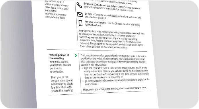 About the Meeting Non-registered (beneficial) shareholders See page 11 for (your package includes a voting instruction form) important details You’re a non-registered shareholder if you hold your shares through an about voting by intermediary (a bank, trust company, securities broker or other financial proxy. institution). This means the shares are registered in your intermediary’s name and you’re the beneficial shareholder. Vote by proxy You can vote your shares in one of four ways: You or your authorized On the internet – Go to the website indicated on your voting representative must instruction form and follow the instructions on screen. complete the voting By phone (Canada and U.S. only) – Call the toll-free number on instruction form. If your voting instruction form and follow the instructions. you’re a corporation or other legal entity, your authorized By mail – Complete your voting instruction form and return it in representative must the envelope provided. complete the form. On your smartphone – Use the QR code found on your voting instruction form. Your intermediary must receive your voting instructions with enough time to act on your instructions. Check the form for the deadline for submitting your voting instructions. If you’re mailing your voting instruction form, be sure to allow enough time for the envelope to be delivered. The deadline for the deposit of proxies can be waived by the Chair of the Board at his discretion, without notice. Vote in person at First, appoint yourself as proxyholder by printing your name in the space the meeting provided on the voting instruction form. You can also appoint someone You must appoint else to be your proxyholder (see page 11 for more information). You can yourself (or another do this in one of two ways: person) as • sign and return the form in the envelope provided but do not fill in your proxyholder. voting instructions because you will vote during the meeting (check the Then you or the form for the deadline for submitting it, and make sure you allow enough person you appoint time for the envelope to be delivered), or need to bring photo • go to the website indicated on the voting instruction form and follow the identification with instructions. you to the meeting. Then, when you arrive at the meeting, check in with our transfer agent. 2023 Management information circular 9