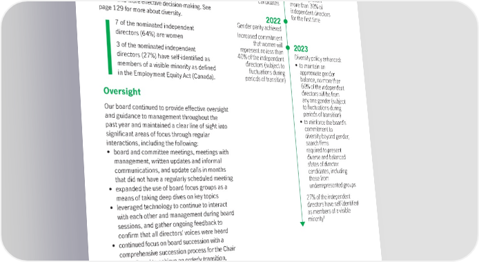 Key things about the board Diversity 2008 Gail Cook-Bennett is Our board recognizes the importance of diversity 2012 the first woman to and is committed to fostering diversity at all levels of Diversity policy serve as Chair of the the organization. The board has a long history of adopted, establishing Manulife Board promoting diversity and believes that having highly characteristics 2013 qualified directors from diverse backgrounds brings considered in different perspectives and experiences to the identifying board Women represent boardroom, generating healthy discussion and candidates more than 30% of debate and more effective decision-making. See independent directors page 129 for more about diversity. 2022 for the first time Gender parity achieved 7 of the nominated independent Increased commitment directors (64%) are women that women will 2023 3 of the nominated independent represent no less than Diversity policy enhanced: directors (27%) have self-identified as 40% of the independent • to maintain an members of a visible minority as defined directors (subject to appropriate gender fluctuations during balance, no more than in the Employment Equity Act (Canada). periods of transition) 60% of the independent Oversight directors will be from any one gender (subject Our board continued to provide effective oversight to fluctuations during and guidance to management throughout the periods of transition) past year and maintained a clear line of sight into • to reinforce the board’s commitment to significant areas of focus through regular diversity beyond gender, interactions, including the following: search firms • board and committee meetings, meetings with required to present management, written updates and informal diverse and balanced communications, and update calls in months slates of director that did not have a regularly scheduled meeting candidates, including those from • expanded the use of board focus groups as a underrepresented groups means of taking deep dives on key topics 27% of the independent • leveraged technology to continue to interact directors have self-identified with each other and management during board as members of a visible sessions, and gather ongoing feedback to minority1 confirm that all directors’ voices were heard • continued focus on board succession with a comprehensive succession process for the Chair of the Board to achieve an orderly transition, resulting in the appointment of Don Lindsay as Chair of the Board on February 15, 2023 • reviewed committee membership in light of the Chair of the Board succession process, implementing changes to reflect changing circumstances while maintaining effective oversight • implemented a hybrid meeting schedule with both in-person and virtual meetings to balance the importance of in-person interactions and the flexibility of virtual meetings given the global nature of the board to achieve optimal participation from all directors and to help attract talented directors from across the globe. 1 as defined in the Employment Equity Act (Canada). 16 Manulife Financial Corporation