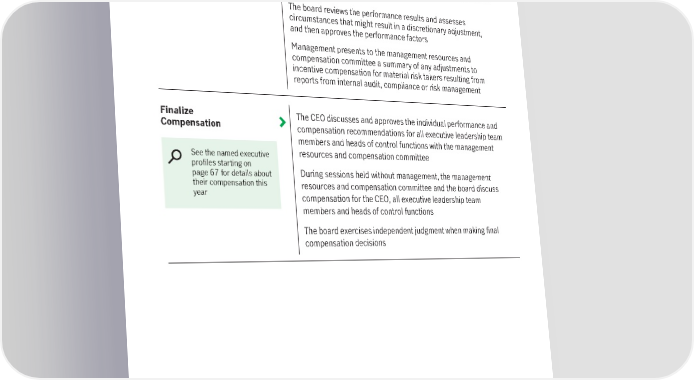 Executive Compensation Assess The CFO presents and discusses the business performance performance results with the management resources and compensation committee See pages 58 and 65 for The independent advisor provides their perspective on the this year’s performance soundness of performance measures and standards used for the results incentive plans The management resources and compensation committee reviews the performance factors for the annual incentive plan and performance share units The board reviews the performance results and assesses circumstances that might result in a discretionary adjustment, and then approves the performance factors Management presents to the management resources and compensation committee a summary of any adjustments to incentive compensation for material risk takers resulting from reports from internal audit, compliance or risk management Finalize The CEO discusses and approves the individual performance and Compensation compensation recommendations for all executive leadership team members and heads of control functions with the management See the named executive resources and compensation committee profiles starting on page 67 for details about During sessions held without management, the management their compensation this resources and compensation committee and the board discuss year compensation for the CEO, all executive leadership team members and heads of control functions The board exercises independent judgment when making final compensation decisions 2023 Management information circular 109