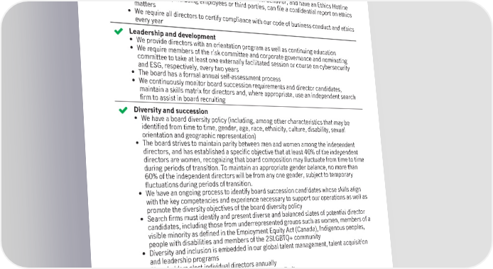 Governance at Manulife What we do Independence • All our directors are independent (except for the CEO) and all members of the board’s committees are independent • Board committees can retain independent advisors • The roles of Chair of the Board and CEO are separate • We have an annual strategic planning meeting separate from regular board meetings • In camera sessions are held at every board and committee meeting Ethics and integrity • We promote a strong culture of integrity and ethical behavior, and have an Ethics Hotline where anyone, including employees or third parties, can file a confidential report on ethics matters • We require all directors to certify compliance with our code of business conduct and ethics every year Leadership and development • We provide directors with an orientation program as well as continuing education • We require members of the risk committee and corporate governance and nominating committee to take at least one externally facilitated session or course on cybersecurity and ESG, respectively, every two years • The board has a formal annual self-assessment process • We continuously monitor board succession requirements and director candidates, maintain a skills matrix for directors and, where appropriate, use an independent search firm to assist in board recruiting Diversity and succession • We have a board diversity policy (including, among other characteristics that may be identified from time to time, gender, age, race, ethnicity, culture, disability, sexual orientation and geographic representation) • The board strives to maintain parity between men and women among the independent directors, and has established a specific objective that at least 40% of the independent directors are women, recognizing that board composition may fluctuate from time to time during periods of transition. To maintain an appropriate gender balance, no more than 60% of the independent directors will be from any one gender, subject to temporary fluctuations during periods of transition. • We have an ongoing process to identify board succession candidates whose skills align with the key competencies and experience necessary to support our operations as well as promote the diversity objectives of the board diversity policy • Search firms must identify and present diverse and balanced slates of potential director candidates, including those from underrepresented groups such as women, members of a visible minority as defined in the Employment Equity Act (Canada), Indigenous peoples, people with disabilities and members of the 2SLGBTQ+ community • Diversity and inclusion is embedded in our global talent management, talent acquisition and leadership programs • Shareholders elect individual directors annually • We have a majority voting policy and director term limits Shareholder engagement and alignment • We have a robust shareholder engagement program with publicly available shareholder engagement principles • We require directors and executives to meet equity ownership guidelines • We have a proxy access policy Risk oversight • We have strong risk oversight, carried out by the board and supported by the risk committee • The audit and risk committees have joint meetings at least once a year 2023 Management information circular 113