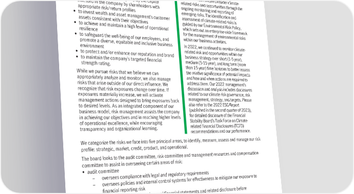 The activities required to achieve our strategy Managing climate-related risks and are guided by our values and involve elements of opportunities risk-taking. When making decisions about risk- As part of its ESG oversight responsibilities, taking and risk management, we place a priority the corporate governance and nominating on the following risk management objectives: committee oversees matters related to • to safeguard the commitments and expectations climate change, and receives regular established with our customers, creditors, reports on relevant climate topics, including shareholders and employees our progress against the commitments set • to support the successful design and delivery of out in Manulife’s Climate Action Plan (see customer solutions through the development of page 135). innovative product solutions, and through providing The Executive Risk Committee and the customer-centric digital experiences board’s risk committee consider climate- • to prudently and effectively deploy the capital related risks and opportunities through the invested in the company by shareholders with ongoing monitoring and reporting of appropriate risk/return profiles emerging risks. The identification and • to invest wealth and asset management’s customer assessment of climate-related risks is assets consistent with their objectives guided by our Environmental Risk Policy, • to achieve and maintain a high level of operational which sets out an enterprise-wide framework resilience for the management of environmental risks • to safeguard the well-being of our employees, and within our business activities. promote a diverse, equitable and inclusive business In 2022, we continued to monitor climate- environment related risk and opportunities within our • to protect and/or enhance our reputation and brand business strategy over short (1-5 year), • to maintain the company’s targeted financial medium (5-15 year), and long term (more strength rating. than 15 year) time horizons to better assess While we pursue risks that we believe we can the relative significance of potential impacts appropriately analyze and monitor, we also manage and how and when actions are required to risks that arise outside of our direct influence. We address them. Our 2022 management’s recognize that risk exposures change over time. If discussion and analysis includes disclosures exposures materially increase, we will activate related to our climate risk governance, risk management actions designed to bring exposures back management, strategy, and targets. Please to desired levels. As an integrated component of our also refer to the 2022 ESG Report business model, risk management assists the company (published in the second quarter of 2023), in achieving our objectives and in reaching higher levels for detailed disclosure of the Financial of operational excellence, while encouraging Stability Board’s Task Force on Climate- transparency and organizational learning. related Financial Disclosures (TCFD) recommendations and our performance. We categorize the risks we face into five principal areas, to identify, measure, assess and manage our risk profile: strategic, market, credit, product, and operational. The board looks to the audit committee, risk committee and management resources and compensation committee to assist in overseeing certain areas of risk: • audit committee – oversees compliance with legal and regulatory requirements – oversees policies and internal control systems for effectiveness to mitigate our exposure to financial reporting risk – reviews our quarterly and annual financial statements and related disclosure before recommending them to the board for their review and approval • risk committee – reviews and assesses our principal risks, including our overall risk profile and reviewing our risk appetite – reviews and assesses our evolving risks – reviews the risk impact of the business plan and new business initiatives – oversees the risk management function – oversees our compliance with risk management policies – evaluates the company’s risk culture • management resources and compensation committee and risk committee – reviews our executive compensation program to ensure alignment against our risk management principles and our risk appetite 120 Manulife Financial Corporation