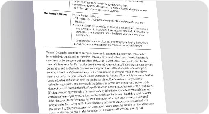 Phil Witherington Mr. Witherington is entitled to: • 18 months of compensation in lieu of notice comprised of base salary and target annual incentive • an annual incentive payment calculated at target for the year in which his active employment ends, pro-rated based on the end date • continuation of group benefits for 18 months (excluding life, short-term and long-term disability insurance) • reimbursement of the costs for his relocation to Hong Kong, provided the relocation occurs within 10 months of his termination date If he commences new employment or self-employment during the severance period: • he will no longer participate in the group benefits plans • severance payments will cease and he will be entitled to a lump sum payment of 50% of the remaining severance payments Marianne Harrison Ms. Harrison is entitled to: • 18 months of compensation comprised of base salary and target annual incentive • continuation of group benefits for 18 months (excluding life, short-term and long-term disability insurance). If she becomes ineligible for COBRA coverage during the severance period, she will no longer participate in the group benefits plan. If she commences new employment or self-employment during the severance period, the severance payments that remain will be reduced by 50.0% Messrs. Costantini and Hartz do not have employment agreements that specify their entitlements if terminated without cause and, therefore, if they are terminated without cause, they may be eligible for severance under the terms and conditions of the John Hancock Officer Severance Pay Plan. The John Hancock Severance Pay Plan provides severance pay (inclusive of annual base salary and annual incentive bonus at target) and benefits continuation to eligible officers at the VP+ level based upon length of service, subject to a 52-week minimum and 78-week maximum severance period. To be eligible for severance under the John Hancock Officer Severance Pay Plan, the officer must (i) have a separation from service due to a reduction in staff, the elimination of the officer’s position, a reorganization or restructuring, a substantial decrease in the duties or responsibilities of the officer’s position, or John Hancock determined that the officer’s qualifications no longer meet the business needs of the Company, (ii) sign a written agreement in a form prescribed by John Hancock, including a release of claims and certain post-employment restrictions, and (iii) satisfy all other terms and conditions as set forth in the John Hancock Officer Severance Pay Plan. The figures in the chart above showing the anticipated severance for Mr. Hartz and Mr. Costantini upon a termination without cause are calculated as of December 31, 2022 and assume, for purposes of this disclosure, that such terminations without cause satisfied all other criteria for eligibility under the John Hancock Officer Severance Pay Plan. Change in control Mr. Gori is the only named executive who has a change in control agreement that protects him from losing employment benefits if there is a change in control. He entered into a change in control agreement when he was appointed President. If there is a change in control and Mr. Gori’s employment is terminated without cause or for good reason within a protection period that starts 90 days before a change in control and ends 24 months after the change in control, he is entitled to: • two times his annual salary and two times his average annual incentive awarded in the prior three years • full vesting and payment of outstanding awards, including those granted within the past year, while performance share units remain subject to applicable performance conditions • continuation of his group benefits for up to two years (excluding life and disability insurance) 100 Manulife Financial Corporation