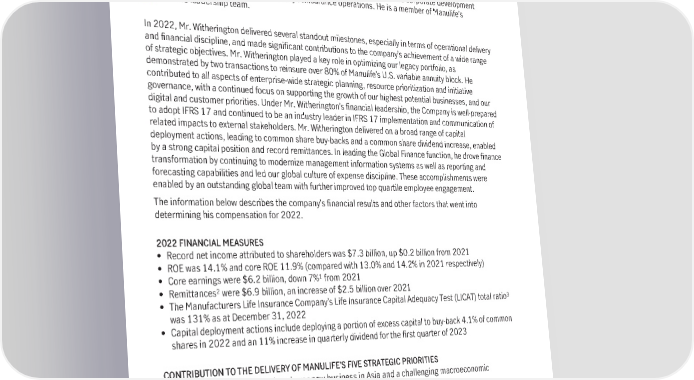 Phil Witherington Chief Financial Officer Mr. Witherington is responsible for managing Manulife’s financial affairs, including financial accounting and reporting; planning and analysis; taxation; investor relations; treasury; capital management and financial regulation, while also overseeing the strategy, transformation and corporate development functions, and our property and casualty reinsurance operations. He is a member of Manulife’s executive leadership team. In 2022, Mr. Witherington delivered several standout milestones, especially in terms of operational delivery and financial discipline, and made significant contributions to the company’s achievement of a wide range of strategic objectives. Mr. Witherington played a key role in optimizing our legacy portfolio, as demonstrated by two transactions to reinsure over 80% of Manulife’s U.S. variable annuity block. He contributed to all aspects of enterprise-wide strategic planning, resource prioritization and initiative governance, with a continued focus on supporting the growth of our highest potential businesses, and our digital and customer priorities. Under Mr. Witherington’s financial leadership, the Company is well-prepared to adopt IFRS 17 and continued to be an industry leader in IFRS 17 implementation and communication of related impacts to external stakeholders. Mr. Witherington delivered on a broad range of capital deployment actions, leading to common share buy-backs and a common share dividend increase, enabled by a strong capital position and record remittances. In leading the Global Finance function, he drove finance transformation by continuing to modernize management information systems as well as reporting and forecasting capabilities and led our global culture of expense discipline. These accomplishments were enabled by an outstanding global team with further improved top quartile employee engagement. The information below describes the company’s financial results and other factors that went into determining his compensation for 2022. 2022 FINANCIAL MEASURES • Record net income attributed to shareholders was $7.3 billion, up $0.2 billion from 2021 • ROE was 14.1% and core ROE 11.9% (compared with 13.0% and 14.2% in 2021 respectively) 1 • Core earnings were $6.2 billion, down 7% from 2021 2 • Remittances were $6.9 billion, an increase of $2.5 billion over 2021 • The Manufacturers Life Insurance Company’s Life Insurance Capital Adequacy Test (LICAT) total ratio3 was 131% as at December 31, 2022 • Capital deployment actions include deploying a portion of excess capital to buy-back 4.1% of common shares in 2022 and an 11% increase in quarterly dividend for the first quarter of 2023 CONTRIBUTION TO THE DELIVERY OF MANULIFE’S FIVE STRATEGIC PRIORITIES • Delivered strong core earnings lower new business in Asia and a challenging macroeconomic environment • Continued to support the growth of our highest potential businesses with a targeted allocation of capital and internal resources to initiatives in our Asia and Global WAM segments resulting in 63% of core earnings from our highest-potential businesses in 2022, a notable improvement of 9 percentage points from the 2017 baseline of 54% 1 Percentage growth in core earnings is stated on a constant exchange rate basis. The items marked with a ESG are directly 2 For more information on this metric, see non-GAAP and other financial measures on page 57. linked to board-approved enterprise goals 3 LICAT ratio is disclosed under the Office of the Superintendent of for ESG-related measures that are key to Financial Institutions Canada’s (“OSFI’s”) Life Insurance Capital our business strategy. Adequacy Test Public Disclosure. 72 Manulife Financial Corporation