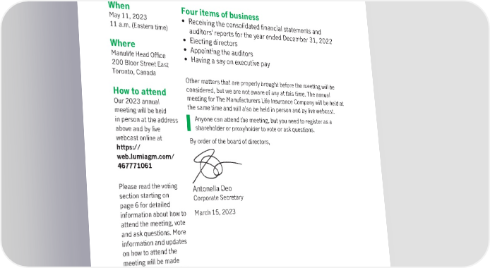 Notice of annual meeting of common shareholders You’re invited to attend our 2023 annual meeting of common shareholders When Four items of business May 11, 2023 • Receiving the consolidated financial statements and 11 a.m. (Eastern time) auditors’ reports for the year ended December 31, 2022 Where • Electing directors • Appointing the auditors Manulife Head Office • Having a say on executive pay 200 Bloor Street East Toronto, Canada Other matters that are properly brought before the meeting will be How to attend considered, but we are not aware of any at this time. The annual Our 2023 annual meeting for The Manufacturers Life Insurance Company will be held at meeting will be held the same time and will also be held in person and by live webcast. in person at the address Anyone can attend the meeting, but you need to register as a above and by live shareholder or proxyholder to vote or ask questions. webcast online at By order of the board of directors, https:// web.lumiagm.com/ 467771061 Please read the voting Antonella Deo section starting on Corporate Secretary page 6 for detailed information about how to March 15, 2023 attend the meeting, vote and ask questions. More information and updates on how to attend the meeting will be made available on our website (https:// www.manulife.com/en/ investors/annual- meeting.html).