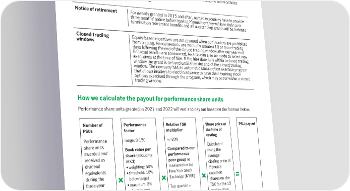 Equity-based incentives Restricted share units Performance share units Stock options Dividend equivalents Credited as additional units at the same rate as Do not earn dividends paid on Manulife common shares and dividend subject to the same vesting conditions as the equivalents underlying grant Grants The grant price is the average closing price for the 10 trading days before the grant date The grant value of stock options is calculated using the Black-Scholes methodology Notice of retirement For awards granted in 2015 and after, named executives have to provide three months’ notice before leaving Manulife or they will lose their post- termination retirement benefits and all outstanding grants will be forfeited Closed trading Equity-based incentives are not granted when our insiders are prohibited windows from trading. Annual awards are normally granted 10 or more trading days following the end of the closed trading window after our year-end financial results are announced. Awards can also be made to select new executives at the time of hire. If the hire date falls within a closed trading window the grant is delayed until after the end of the closed trading window. The company has an automatic stock option exercise program that allows insiders to elect in advance to have their expiring stock options exercised through the program, which may occur within a closed trading window. How we calculate the payout for performance share units Performance share units granted in 2021 and 2022 will vest and pay out based on the formula below. Number of Performance Relative TSR Share price at PSU payout PSUs factor multiplier thetimeof Performance range: 0-150 +/-20% vesting share units Book value per Compared to our Calculated awarded and share (excluding performance using the received as AOCI) peer group as average dividend • weighting: 50% measured on the closing price of equivalents • threshold: 10% New York Stock Manulife during the below target Exchange (NYSE) common three-year • maximum: 8% shares on the period above target Top quartile = TSX for the 10 +20% trading days Core return on 2nd or 3rd quartile before the day equity =+0% the award vests • weighting: 50% Bottom quartile = • threshold: 40% -20% below target • maximum: 32% above target Performance is determined as an average of performance relative to the threshold, target and maximum targets set at the beginning of each of the three years in the performance period. The targets are tied to the board-approved budgets and consistent with our external guidance. 62 Manulife Financial Corporation