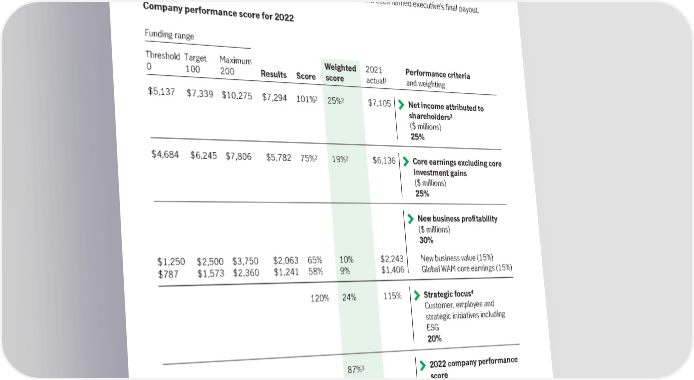 The committee did not make any adjustment to the targets for the unanticipated disruptions to our Asia business due to COVID-19 challenges, or to address changes experienced in the macro-economic environment. In line with principles the committee had established several years ago regarding the treatment of any changes in our P&C Reinsurance business, approximately $80 million (out of $256 million) of the P&C Reinsurance claims provision incurred for Hurricane Ian was excluded from the determination of the annual incentive award score. This adjustment increased the overall performance score by 2 points. For more information about each named executive’s annual incentive award, and a discussion of their performance against their individual goals, see the named executive profiles starting on page 67. Our plan design includes an adjustment for individual performance to determine each named executive’s final payout. Company performance score for 2022 Funding range Threshold Target Maximum Weighted 2021 Performance criteria 0 100 200 Results Score score actual1 and weighting 2 2 $5,137 $7,339 $10,275 $7,294 101% 25% $7,105 Net income attributed to shareholders3 ($ millions) 25% 2 2 $4,684 $6,245 $7,806 $5,782 75% 19% $6,136 Core earnings excluding core investment gains ($ millions) 25% New business profitability ($ millions) 30% $1,250 $2,500 $3,750 $2,063 65% 10% $2,243 New business value (15%) $787 $1,573 $2,360 $1,241 58% 9% $1,406 Global WAM core earnings (15%) 120% 24% 115% Strategic focus4 Customer, employee and strategic initiatives including ESG 20% 3 2022 company performance 87% score 1 This column shows the 2021 actual results for reference. The 2021 company performance score was 142%. 2 The board approved an adjustment of $80 million to partly offset the $256 million charge in P&C Reinsurance related to Hurricane Ian. This amount was determined by applying an approach previously agreed to by the committee that allows for an adjustment to the extent that average return on capital for the P&C Reinsurance business exceeds a specified target. The adjustment had a 3 and 5 point positive impact on the net income and core earnings scores, respectively, and increased the final 2022 company performance score by 2 points. While a full adjustment for Hurricane Ida and European floods would have been allowed in the prior year, the board did not make any adjustment to 2021 scores. 3 Performance at threshold results in a performance score of 25%. Performance below threshold results in a performance score of zero. 4 Performance is assessed against predetermined goals established in our business plan. 58 Manulife Financial Corporation