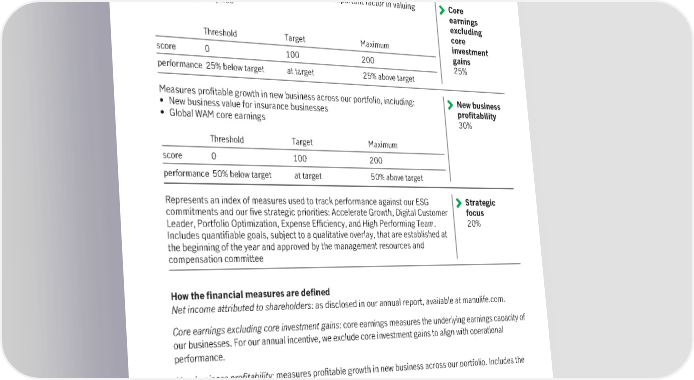 Executive Compensation Performance criteria and weighting for the 2022 awards Aligns compensation with shareholder experience Net income Threshold Target Maximum attributed to shareholders score 25* 100 200 25% performance 30% below target at target 40% above target *Below threshold performance results in a score of zero. Reflects the underlying earnings capacity and is an important factor in valuing Core Manulife’s share price earnings excluding core Threshold Target Maximum investment score 0 100 200 gains 25% performance 25% below target at target 25% above target Measures profitable growth in new business across our portfolio, including: New business • New business value for insurance businesses profitability • Global WAM core earnings 30% Threshold Target Maximum score 0 100 200 performance 50% below target at target 50% above target Represents an index of measures used to track performance against our ESG Strategic commitments and our five strategic priorities: Accelerate Growth, Digital Customer focus Leader, Portfolio Optimization, Expense Efficiency, and High Performing Team. 20% Includes quantifiable goals, subject to a qualitative overlay, that are established at the beginning of the year and approved by the management resources and compensation committee How the financial measures are defined Net income attributed to shareholders: as disclosed in our annual report, available at manulife.com. Core earnings excluding core investment gains: core earnings measures the underlying earnings capacity of our businesses. For our annual incentive, we exclude core investment gains to align with operational performance. New business profitability: measures profitable growth in new business across our portfolio. Includes the following measures: • New business value for insurance businesses represents the change in shareholders’ economic value as a result of sales in the period. Calculated as the present value of shareholders’ interest in expected future distributable earnings, after the cost of capital, on actual new business sold in the period. • Global WAM core earnings: core earnings of our Global WAM segment, which provides fee-based wealth and asset management solutions to our retail, retirement and institutional customers around the world. 2023 Management information circular 55
