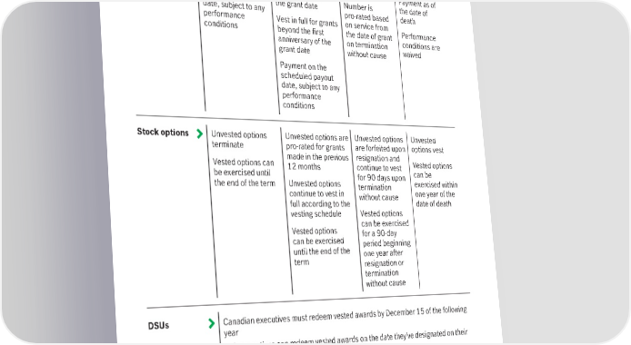 Normal 1, 2 retirement 1, 2 Early retirement • 65 years old, or • 55 years old and • 55 years old and age plus age plus Resignation or continuous service continuous service termination totals at least 65 totals at least 70 without cause Death RSUs/PSUs Number is pro-rated Number is pro-rated Forfeited on Vest in full Payment on the for grants within the resignation Payment as of scheduled payout first anniversary of Number is the date of date, subject to any the grant date pro-rated based death performance Vest in full for grants on service from Performance conditions beyond the first the date of grant conditions are anniversary of the on termination waived grant date without cause Payment on the scheduled payout date, subject to any performance conditions Stock options Unvested options Unvested options are Unvested options Unvested terminate pro-rated for grants are forfeited upon options vest Vested options can made in the previous resignation and Vested options be exercised until 12 months continue to vest can be the end of the term Unvested options for 90 days upon exercised within continue to vest in termination one year of the full according to the without cause date of death vesting schedule Vested options Vested options can be exercised can be exercised for a 90-day until the end of the period beginning term one year after resignation or termination without cause DSUs Canadian executives must redeem vested awards by December 15 of the following year U.S. executives can redeem vested awards on the date they’ve designated on their deferral election form 1 Named executive must notify us three months before retiring. Vested stock options that were granted up to and including in 2014 can be exercised for up to three years following retirement (defined as 55 years old and 10 years continuous service, while normal retirement is defined as 65 years old). 2 We changed our definitions of early and normal retirement effective January 27, 2020, to ensure award terms for mid- and later- career hires are competitive: • early retirement: 55 years old and age plus continuous service totals at least 60 • normal retirement: 55 years old and age plus continuous services totals at least 65. 102 Manulife Financial Corporation