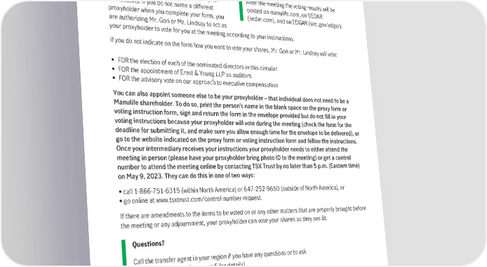 About the Meeting More about voting by proxy Voting by proxy is the easiest way to vote. It About confidentiality and voting results means you’re giving someone else (your Our transfer agent independently counts and proxyholder) the authority to attend the meeting tabulates the votes to maintain confidentiality. and vote for you according to your instructions. A proxy form or voting instruction form is only Roy Gori, President and Chief Executive Officer referred to us if it’s clear that a shareholder or, in his place, Donald R. Lindsay, Chair of the wants to communicate with the board or Board (with full power of substitution) have management, the validity of the form is in agreed to act as Manulife proxyholders to vote question, or the law requires it. your shares at the meeting according to your After the meeting the voting results will be instructions. If you do not name a different posted on manulife.com, on SEDAR proxyholder when you complete your form, you (sedar.com), and on EDGAR (sec.gov/edgar). are authorizing Mr. Gori or Mr. Lindsay to act as your proxyholder to vote for you at the meeting according to your instructions. If you do not indicate on the form how you want to vote your shares, Mr. Gori or Mr. Lindsay will vote: • FOR the election of each of the nominated directors in this circular • FOR the appointment of Ernst & Young LLP as auditors • FOR the advisory vote on our approach to executive compensation You can also appoint someone else to be your proxyholder – that individual does not need to be a Manulife shareholder. To do so, print the person’s name in the blank space on the proxy form or voting instruction form, sign and return the form in the envelope provided but do not fill in your voting instructions because your proxyholder will vote during the meeting (check the form for the deadline for submitting it, and make sure you allow enough time for the envelope to be delivered), or go to the website indicated on the proxy form or voting instruction form and follow the instructions. Once your intermediary receives your instructions your proxyholder needs to either attend the meeting in person (please have your proxyholder bring photo ID to the meeting) or get a control number to attend the meeting online by contacting TSX Trust by no later than 5 p.m. (Eastern time) on May 9, 2023. They can do this in one of two ways: • call 1-866-751-6315 (within North America) or 647-252-9650 (outside of North America), or • go online at www.tsxtrust.com/control-number-request. If there are amendments to the items to be voted on or any other matters that are properly brought before the meeting or any adjournment, your proxyholder can vote your shares as they see fit. Questions? Call the transfer agent in your region if you have any questions or to ask for a new proxy form (see page 5 for details). 2023 Management information circular 11