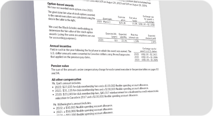 Executive Compensation Share-based awards Exchange rate for The grant date fair value of performance Grant date Share price awards in U.S. dollars share units, restricted share units and 2022 March 1 $ 26.54 US$1.00 = $1.2728 deferred share units awarded to the named August 29 $ 23.80 US$1.00 = $1.2952 2021 March 2 $ 25.15 US$1.00 = $1.2634 executives is shown in the table to the right. 2020 March 3 $ 24.38 US$1.00 = $1.3298 For 2022 and 2021 share-based award grants, the grant price is the average closing price for the 10 trading days before the grant date. For the 2020 shared-based award grant, the grant date fair value is the closing price of a Manulife common share on the TSX on the last trading day before the grant date or the average closing price for the last 10 trading days before the grant date (whichever is higher). Mr. Costantini’s amount for 2022 includes a one-time award of US$1,500,000 in restricted share units, granted on August 29, 2022, to replace compensation of similar value and with similar vesting conditions that he forfeited from his previous employer. The restricted share units vest 50% on August 29, 2023 and 50% on August 29, 2024. Option-based awards We have not awarded stock options since 2020. Exchange rate The grant date fair value of stock options awarded Exercise Fair value for awards in to the named executives was calculated using the Grant date price factor U.S. dollars data in the table to the right. 2020 March 3 $24.38 15.0% US$1.00 = $1.3298 We used the Black-Scholes methodology to determine the fair value of the stock option Expected life Expected Risk-free Expected awards (using the same assumptions we use (years) volatility interest rate dividend yield for accounting purposes): 2020 8.0 23.0% 1.50% 3.50% Annual incentive Exchange rate for Paid in cash in the year following the fiscal year in which the award was earned. The awards in U.S. dollars U.S. dollar amounts were converted to Canadian dollars using the exchange rates 2022 US$1.00 = $1.3411 that applied on the previous pay dates. 2021 US$1.00 = $1.2686 2020 US$1.00 = $1.2686 Pension value The sum of the amounts under compensatory change for each named executive in the pension tables on pages 93 and 94. All other compensation Mr. Gori’s amount includes: • 2022: $27,035 for club membership fees and a $100,000 flexible spending account allowance. • 2021: $31,139 for club membership fees and a $100,000 flexible spending account allowance. • 2020: $23,249 for club membership fees, $43,557 reimbursement for a disallowed tax credit related to his relocation to Canada in 2017 and a $100,000 flexible spending account allowance. Mr. Witherington’s amount includes: • 2022: a $50,000 flexible spending account allowance. • 2021: a $50,000 flexible spending account allowance. • 2020: a $50,000 flexible spending account allowance. Mr. Costantini’s amount includes: • 2022: a one-time payment of US$750,000 to replace compensation forfeited from his previous employer. Ms. Harrison’s amount includes: • 2022: $8,189 in total perquisites. • 2021: $7,416 in total perquisites. • 2020: $7,416 in total perquisites. 2023 Management information circular 87