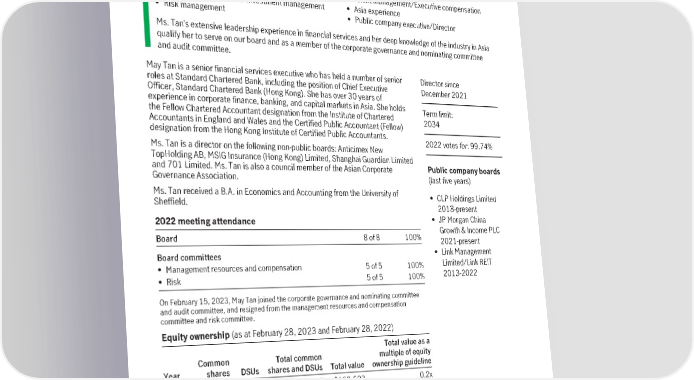 May Tan Hong Kong/Age 67/Independent Key competencies and experience • Finance/Accounting • Talent management/Executive compensation • Insurance/Reinsurance/Investment management • Asia experience • Risk management • Public company executive/Director Ms. Tan’s extensive leadership experience in financial services and her deep knowledge of the industry in Asia qualify her to serve on our board and as a member of the corporate governance and nominating committee and audit committee. May Tan is a senior financial services executive who has held a number of senior Director since roles at Standard Chartered Bank, including the position of Chief Executive December 2021 Officer, Standard Chartered Bank (Hong Kong). She has over 30 years of experience in corporate finance, banking, and capital markets in Asia. She holds Term limit: the Fellow Chartered Accountant designation from the Institute of Chartered 2034 Accountants in England and Wales and the Certified Public Accountant (Fellow) designation from the Hong Kong Institute of Certified Public Accountants. 2022 votes for: 99.74% Ms. Tan is a director on the following non-public boards: Anticimex New TopHolding AB, MSIG Insurance (Hong Kong) Limited, Shanghai Guardian Limited and 701 Limited. Ms. Tan is also a council member of the Asian Corporate Public company boards Governance Association. (last five years) Ms. Tan received a B.A. in Economics and Accounting from the University of • CLP Holdings Limited Sheffield. 2018-present 2022 meeting attendance • JP Morgan China Board 8 of 8 100% Growth & Income PLC 2021-present Board committees • Link Management • Management resources and compensation 5 of 5 100% Limited/Link REIT • Risk 5 of 5 100% 2013-2022 On February 15, 2023, May Tan joined the corporate governance and nominating committee and audit committee, and resigned from the management resources and compensation committee and risk committee. Equity ownership (as at February 28, 2023 and February 28, 2022) Total value as a Common Total common multiple of equity Year shares DSUs shares and DSUs Total value ownership guideline 2023 0 6,287 6,287 $169,623 0.2x 2022 0 449 449 $11,530 0.0x Change 0 5,838 5,838 Ms. Tan joined the board on December 1, 2021. Under the director equity ownership requirements, she is expected to meet the equity ownership requirements within six years of joining the board. With the changes to director compensation that went into effect January 1, 2023, the equity ownership requirement increased to $1,041,089 (US$765,000). The total value as a multiple of equity ownership guideline shown above relates to the guideline in effect for each respective year. See page 5 for information about equity ownership 28 Manulife Financial Corporation