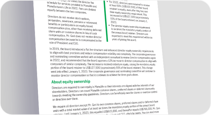 About the Directors How we pay our directors We structure director compensation with three Key features of the director compensation goals in mind: structure: • to reflect directors’ responsibilities, time • Directors and the Chair of the Board are commitment and expected contribution paid a single annual retainer. No meeting • to align directors’ interests with those of our fees or travel allowances are provided. shareholders • Committee chairs receive an additional • to be competitive with global financial institutions retainer to recognize the additional that are comparable to us in scope and responsibilities and workload required by complexity. this leadership role. • For 2022, directors were required to receive The table on page 36 shows the director fee at least 50% (US$102,500) of their board schedule for services provided to Manulife and retainer in equity, even after they had met Manufacturers Life in 2022. Fees are divided their equity ownership requirement. This equally between the two companies. increased to US$127,500 (approximately Directors do not receive stock options, 55% of the board retainer) on January 1, perquisites, severance, pension or retirement 2023. benefits or participate in an equity-based • The director equity ownership requirement compensation plan, other than receiving deferred is six times the mandatory equity portion of share units or common shares in lieu of cash the annual board retainer. Directors are compensation. Mr. Gori does not receive director expected to meet this requirement within six compensation because he is compensated in the years of joining the board. role of President and CEO. In 2019, the board introduced a flat fee structure and enhanced director equity ownership requirements to align with best practices and reduce compensation volatility and complexity. The corporate governance and nominating committee worked with an independent consultant to review director compensation again in 2022, and recommended that the board approve a 12% increase to director compensation to align with companies of similar complexity. The increase is received entirely in equity, raising the mandatory equity portion of the board retainer to US$127,500 (approximately 55% of the board retainer). This change went into effect January 1, 2023. The corporate governance and nominating committee will continue to monitor director compensation so that it continues to achieve the three goals above. About equity ownership Directors are required to own equity in Manulife so their interests are aligned with the interests of our shareholders. Directors can count Manulife common shares, preferred shares or deferred share units towards meeting the ownership guidelines. Directors can beneficially own the shares or exercise control or direction over them. We require all directors except Mr. Gori to own common shares, preferred shares and/or deferred share units with a total market value of at least six times the mandatory equity portion of the annual board retainer. Until January 1, 2023, this equaled US$615,000, and thereafter equals US$765,000. Mr. Gori has separate equity ownership requirements as President and CEO, which he meets. You can read more about this on page 107. See pages 18 to 29 for information about each nominated director’s equity ownership. Until January 1, 2023 directors were required to receive at least 50% (US$102,500) of their board retainer in equity. This increased to US$127,500, or approximately 55% on January 1, 2023. Directors are expected to meet their equity ownership requirements within six years of joining the board. All directors who have served six years or more meet or exceed their equity ownership requirement. About deferred share units Deferred share units are notional shares that have the same value as Manulife common shares and earn additional units as dividend equivalents at the same rate as dividends paid on our common shares. 2023 Management information circular 35