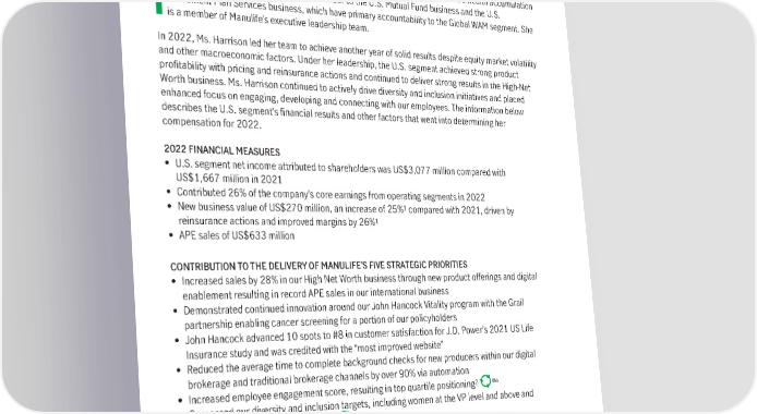 Marianne Harrison President and CEO, John Hancock Ms. Harrison is responsible for all aspects of the company’s U.S. segment, including providing life insurance products and administering inforce long term care and insurance-based wealth accumulation products. She also operates as a matrix leader to the U.S. Mutual Fund business and the U.S. Retirement Plan Services business, which have primary accountability to the Global WAM segment. She is a member of Manulife’s executive leadership team. In 2022, Ms. Harrison led her team to achieve another year of solid results despite equity market volatility and other macroeconomic factors. Under her leadership, the U.S. segment achieved strong product profitability with pricing and reinsurance actions and continued to deliver strong results in the High-Net Worth business. Ms. Harrison continued to actively drive diversity and inclusion initiatives and placed enhanced focus on engaging, developing and connecting with our employees. The information below describes the U.S. segment’s financial results and other factors that went into determining her compensation for 2022. 2022 FINANCIAL MEASURES • U.S. segment net income attributed to shareholders was US$3,077 million compared with US$1,667 million in 2021 • Contributed 26% of the company’s core earnings from operating segments in 2022 1 • New business value of US$270 million, an increase of 25% compared with 2021, driven by 1 reinsurance actions and improved margins by 26% • APE sales of US$633 million CONTRIBUTION TO THE DELIVERY OF MANULIFE’S FIVE STRATEGIC PRIORITIES • Increased sales by 28% in our High Net Worth business through new product offerings and digital enablement resulting in record APE sales in our international business • Demonstrated continued innovation around our John Hancock Vitality program with the Grail partnership enabling cancer screening for a portion of our policyholders • John Hancock advanced 10 spots to #8 in customer satisfaction for J.D. Power’s 2021 US Life Insurance study and was credited with the “most improved website” • Reduced the average time to complete background checks for new producers within our digital brokerage and traditional brokerage channels by over 90% via automation 2 ESG • Increased employee engagement score, resulting in top quartile positioning • Surpassed our diversity and inclusion targets, including women at the VP level and above and percentage of BIPOC new graduates ESG • Recognized as a “Best Place to Work for LGBTQ+ Equality” for the 8th year in a row ESG • Executed an effective return to office and saw low voluntary attrition compared to the industry and market ESG The items marked with a ESG are 1 Percentage growth in new business value is stated on a directly linked to enterprise goals for constant exchange rate basis. ESG-related measures that are key to 2 Quartile ranking based on the Gallup overall workgroup level our business strategy. global/multi-industry database. 78 Manulife Financial Corporation