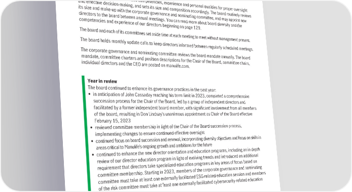 Governance at Manulife About the Manulife board The board is responsible for overseeing our business and affairs as set out in the board’s mandate. You can read about the board’s responsibilities in more detail beginning on page 118, and you will find a copy of the board’s mandate on manulife.com as well as on SEDAR (sedar.com). The board carries out its responsibilities directly and through its four committees, which you can read about beginning on page 117. Other than the CEO, all of our directors are independent, and all members of the board’s committees are independent. This ensures the board and committees can effectively oversee all aspects of our business and act in Manulife’s best interests. The board needs a mix of certain competencies, experience and personal qualities for proper oversight and effective decision-making, and sets its size and composition accordingly. The board routinely reviews its size and make-up with the corporate governance and nominating committee, and may appoint new directors to the board between annual meetings. You can read more about board diversity and the competencies and experience of our directors beginning on page 129. The board and each of its committees set aside time at each meeting to meet without management present. The board holds monthly update calls to keep directors informed between regularly scheduled meetings. The corporate governance and nominating committee reviews the board mandate annually. The board mandate, committee charters and position descriptions for the Chair of the Board, committee chairs, individual directors and the CEO are posted on manulife.com. Year in review The board continued to enhance its governance practices in the past year: • in anticipation of John Cassaday reaching his term limit in 2023, completed a comprehensive succession process for the Chair of the Board, led by a group of independent directors and facilitated by a former independent board member, with significant involvement from all members of the board, resulting in Don Lindsay’s unanimous appointment as Chair of the Board effective February 15, 2023 • reviewed committee membership in light of the Chair of the Board succession process, implementing changes to ensure continued effective oversight • continued focus on board succession and renewal, incorporating diversity objectives and focus on skills in areas critical to Manulife’s ongoing growth and ambitions for the future • continued to enhance the new director orientation and education programs, including an in-depth review of our director education program in light of evolving trends and introduced an additional requirement that directors take specialized education programs in key areas of focus based on committee membership. Starting in 2023, members of the corporate governance and nominating committee must take at least one externally facilitated ESG-related education session and members of the risk committee must take at least one externally facilitated cybersecurity-related education session every two years. • expanded the use of board focus groups to delve more deeply into key topics • increased board focus on, and engagement in respect of, ESG matters • implemented a hybrid meeting schedule (in-person vs. virtual) given the global nature of board to ensure optimal participation from all directors and to help attract talented directors from across the globe. • completed, with the assistance of an independent consultant, a review of director compensation resulting in a 12% increase, to align with companies of similar complexity. The increase is received entirely in equity, raising the mandatory equity portion of the board retainer to $127,500 (approximately 55% of the board retainer). 2023 Management information circular 115