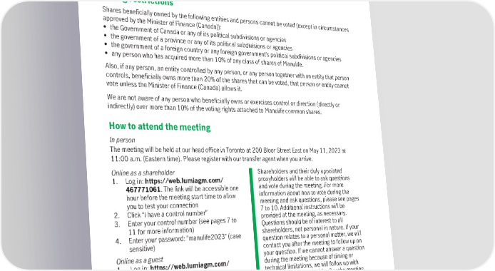 Who can vote If you held Manulife common shares as of 5 p.m. About quorum (Eastern time) on March 15, 2023 (the record Before the meeting can go ahead, at least two date), you’re entitled to receive notice of, and shareholders have to be present at the vote at, our 2023 annual meeting. We had meeting, in person or by proxy. 1,858,297,688 common shares outstanding as of this date and each share carries one vote. We must receive a simple majority of votes cast for an item to be approved. Voting restrictions Shares beneficially owned by the following entities and persons cannot be voted (except in circumstances approved by the Minister of Finance (Canada)): • the Government of Canada or any of its political subdivisions or agencies • the government of a province or any of its political subdivisions or agencies • the government of a foreign country or any foreign government’s political subdivisions or agencies • any person who has acquired more than 10% of any class of shares of Manulife. Also, if any person, an entity controlled by any person, or any person together with an entity that person controls, beneficially owns more than 20% of the shares that can be voted, that person or entity cannot vote unless the Minister of Finance (Canada) allows it. We are not aware of any person who beneficially owns or exercises control or direction (directly or indirectly) over more than 10% of the voting rights attached to Manulife common shares. How to attend the meeting In person The meeting will be held at our head office in Toronto at 200 Bloor Street East on May 11, 2023 at 11:00 a.m. (Eastern time). Please register with our transfer agent when you arrive. Online as a shareholder Shareholders and their duly appointed 1. Log in: https://web.lumiagm.com/ proxyholders will be able to ask questions 467771061. The link will be accessible one and vote during the meeting. For more hour before the meeting start time to allow information about how to vote during the you to test your connection meeting and ask questions, please see pages 2. Click “I have a control number” 7 to 10. Additional instructions will be 3. Enter your control number (see pages 7 to provided at the meeting, as necessary. 11 for more information) Questions should be of interest to all 4. Enter your password: “manulife2023” (case shareholders, not personal in nature. If your sensitive) question relates to a personal matter, we will contact you after the meeting to follow up on Online as a guest your question. If we cannot answer a question 1. Log in: https://web.lumiagm.com/ during the meeting because of timing or 467771061. technical limitations, we will follow up with 2. Click “I am a guest” and then complete the you as soon as practicable after the meeting. required fields. Anyone can attend the meeting as a guest, but guests cannot vote or ask questions. More information and updates on how to attend the meeting will be available on our website (https://www.manulife.com/en/ investors/annual-meeting.html). 6 Manulife Financial Corporation